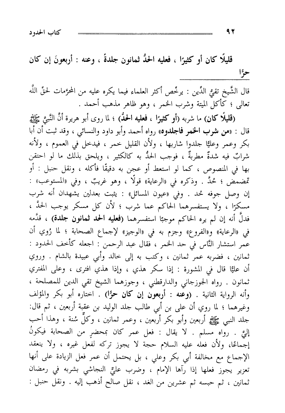 "قليلا كان" ما شربه "أو كثيرا فعليه الحد" لما روى أبو هريرة أن النبي صلى الله عليه وسلم قال "من شرب الخمر فاجلدوه" رواه أحمد وأبو داود والنسائي وقد ثبت أن أبا بكر وعمر وعليا جلدوا شاربها ولأن القليل خمر فيدخل في العموم ولأنه شراب فيه شدة مطربة فوجب الحد به كالكثير ويلحق بذلك ما لو احتقن بها في المنصوص كما لو استعط أو عجن به دقيقا فأكله ونقل حنبل أو تمضمض حد وذكره في الرعاية قولا وهو غريب وفي المستوعب إن وصل جوفه حد وفي عيون المسائل يثبت بعدلين يشهدان أنه شرب مسكرا ولا يستفسرهما الحاكم عما شرب لأن كل مسكر يوجب الحد فدل أنه إن لم يره الحاكم موجبا استفسرهما "فعليه الحد ثمانون جلدة" قدمه في الرعاية والفروع وجزم به في الوجيز لإجماع الصحابة لما روي أن عمر استشار الناس في حد الخمر فقال عبد الرحمن اجعله كأخف الحدود ثمانين فضربه عمر ثمانين وكتب به إلى خالد وأبي عبيدة بالشام وروي أن عليا قال في المشورة إذا سكر هذي وإذا هذي افترى وعلى المفتري ثمانون رواه الجوزجاني والدارقطني وجوزهما الشيخ تقي الدين للمصلحة وأنه الرواية الثانية وعنه أربعون إن كان حرا اختاره أبو بكر والمؤلف وغيرهما لما روي "أن على بن أبي طالب جلد الوليد بن عقبة أربعين ثم قال جلد النبي صلى الله عليه وسلم أربعين وأبو بكر أربعين وعمر ثمانين وكل سنة وهذا أحب إلي" رواه مسلم لا يقال فعل عمر كان بمحضر من الصحابة فيكون إجماعا ولأن فعله عليه السلام حجة لا يجوز تركه لفعل غيره ولا ينعقد الإجماع مع مخالفة أبي بكر وعلي بل يحتمل أن عمر فعل الزيادة على أنها تعزير يجوز فعلها إذا رآها الإمام وضرب علي النجاشي بشربه في رمضان ثمانين ثم حبسه ثم عشرين من الغد نقل صالح أذهب إليه ونقل حنبل