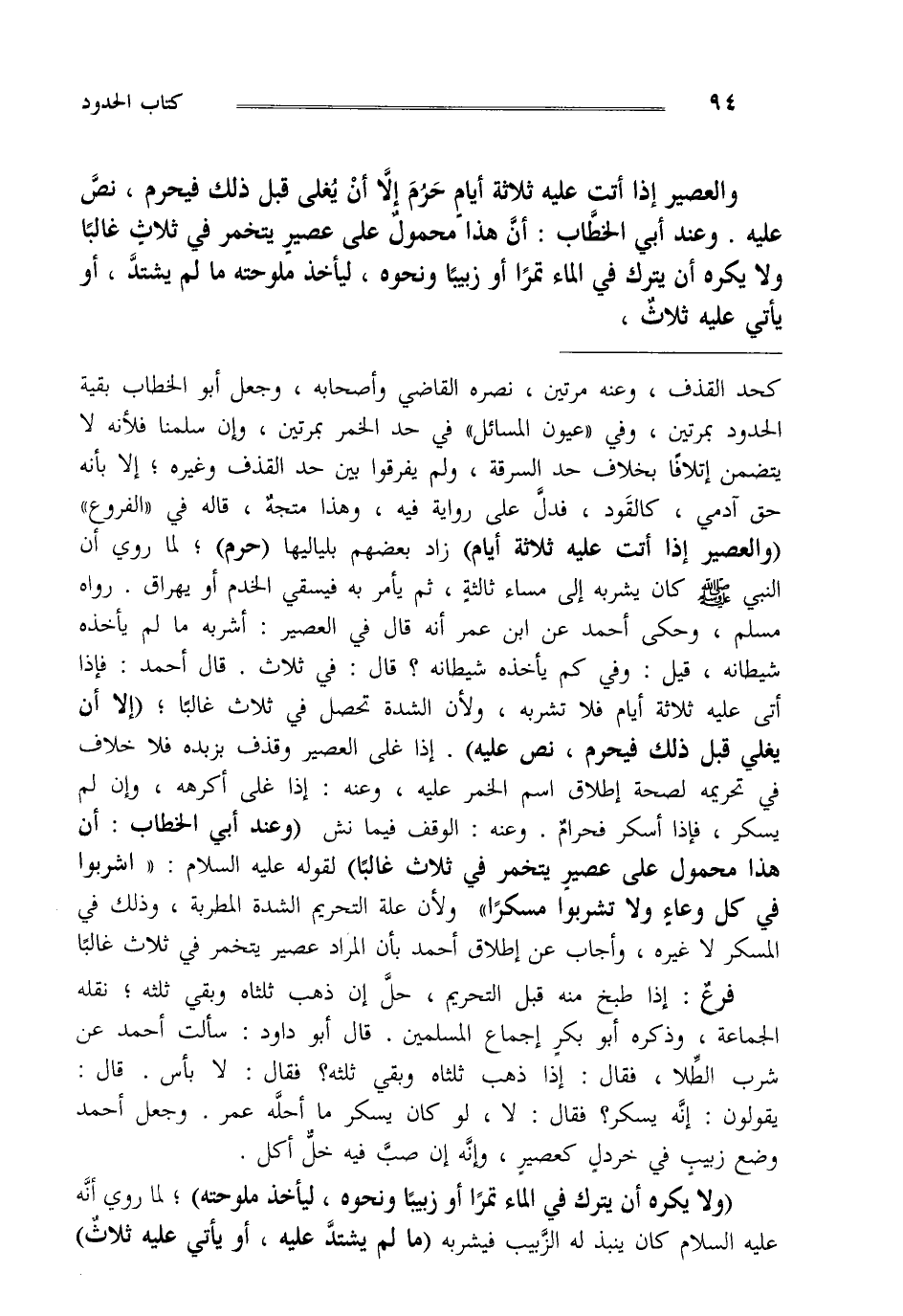 كحد القذف وعنه مرتين نصره القاضي وأصحابه وجعل أبو الخطاب بقية الحدود بمرتين وفي عيون المسائل في حد الخمر بمرتين وإن سلمنا فلأنه لا يتضمن إتلافا بخلاف حد السرقة ولم يفرقوا بين حد القذف وغيره إلا بأنه حق آدمي كالقود فدل على رواية فيه وهذا متجه قاله في الفروع "والعصير إذا أتت عليه ثلاثة أيام" زاد بعضهم بلياليها "حرم" لما روي "أن النبي صلى الله عليه وسلم كان يشربه إلى مساء ثالثة ثم يأمر به فيسقي الخدم أو يهراق" رواه مسلم وحكى أحمد عن ابن عمر أنه قال في العصير أشربه ما لم يأخذه شيطانه قيل وفي حرز يأخذه شيطانه قال في ثلاث قال أحمد فإذا أتى عليه ثلاثة أيام فلا تشربه ولأن الشدة تحصل في ثلاث غالبا "إلا أن يغلى قبل ذلك فيحرم نص عليه" إذا غلى العصير وقذف بزبده فلا خلاف في تحريمه لصحة إطلاق اسم الخمر عليه وعنه إذا غلى أكرهه وإن لم يسكر فإذا أسكر فحرام وعنه الوقف فيما نش "وعند أبي الخطاب أن هذا محمول على عصير يتخمر في ثلاث غالبا" لقوله عليه السلام "اشربوا في كل وعاء ولا تشربوا مسكرا" ولأن علة التحريم الشدة المطربة وذلك في المسكر لا غيره وأجاب عن إطلاق أحمد بأن المراد عصير يتخمر في ثلاث غالبا.