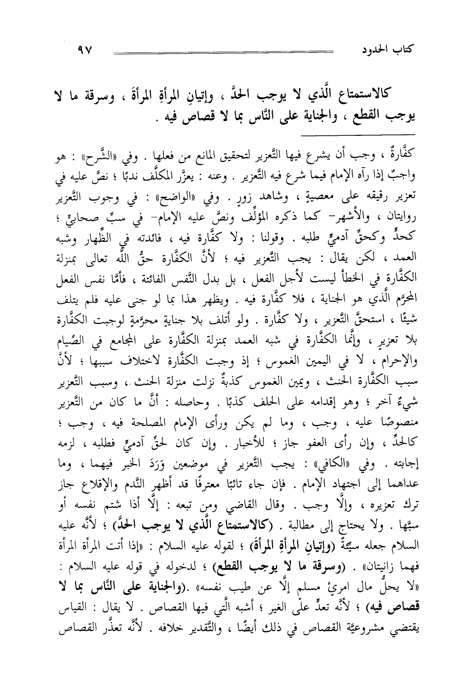 كفارة وجب أن يشرع فيها التعزير لتحقيق المانع من فعلها وفي الشرح هو واجب إذا رآه الإمام فيما شرع فيه التعزير وعنه يعزر المكلف ندبا نص عليه في تعزير رقيقه على معصية وشاهد زور وفي الواضح في وجوب التعزير روايتان والأشهر كما ذكره المؤلف ونص عليه الإمام في سب صحابي كحد وكحق آدمي طلبه وقولنا ولا كفارة فيه فائدته في الظهار وشبه العمد لكن يقال يجب التعزير فيه لأن الكفارة حق الله تعالى بمنزلة الكفارة في الخطأ ليست لأجل الفعل بل بدل النفس الفائتة فأما نفس الفعل المحرم الذي هو الجناية فلا كفارة فيه ويظهر هذا بما لو جنى عليه فلم يتلف شيئا استحق التعزير ولا كفارة ولو أتلف بلا جناية محرمة لوجبت الكفارة بلا تعزير وإنما الكفارة في شبه العمد بمنزلة الكفارة على المجامع في الصيام والإحرام لا في اليمين الغموس إذ وجبت الكفارة لاختلاف سببها لأن سبب الكفارة الحنث ويمين الغموس كذبة نزلت منزلة الحنث وسبب التعزير شيء آخر وهو إقدامه على الحلف كذبا وحاصله أن ما كان من التعزير منصوصا عليه وجب وما لم يكن ورأى الإمام المصلحة فيه وجب كالحد وإن رأى العفو جاز للأخبار وإن كان لحق آدمي فطلبه لزمه إجابته وفي الكافي يجب التعزير في موضعين ورد الخبر فيهما وما عداهما إلى اجتهاد الإمام فإن جاء تائبا معترفا قد أظهر الندم والإقلاع جاز ترك تعزيره وإلا وجب وقال القاضي ومن تبعه إلا إذا شتم نفسه أو سبها ولا يحتاج إلى مطالبة كالاستمتاع الذي لا يوجب الحد لأنه عليه السلام جعله سيئة وإتيان المرأة المرأة لقوله عليه السلام "إذا أتت المرأة المرأة فهما زانيتان" وسرقة ما لا يوجب القطع لدخوله في قوله عليه السلام "لا يحل مال امرئ مسلم إلا عن طيب نفسه" والجناية على الناس بما لا قصاص فيه لأنه تعد على الغير أشبه التي فيها القصاص لا يقال القياس يقتضي مشروعية القصاص في ذلك أيضا والتقدير خلافه لأنه تعذر القصاص