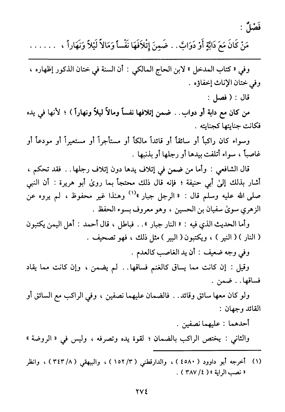 مَنْ كَانَ مَعَ دَابَّةٍ أَوْ دَوَابَّ .. ضَمِنَ إِتْلاَفَهَا نَفْسًا وَمَالًا لَيْلًا وَنَهارًا،