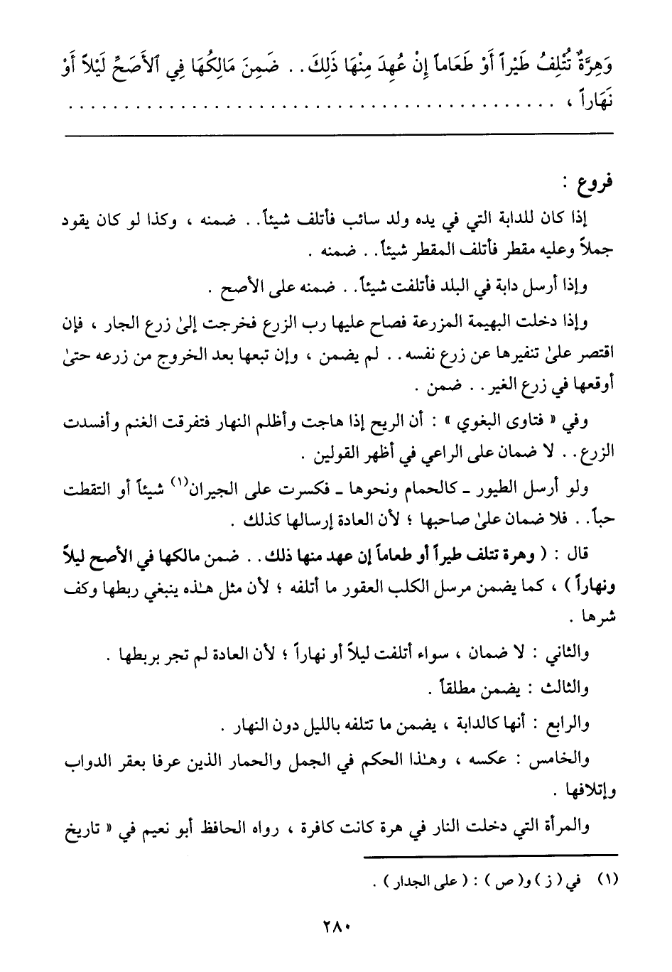 وَهِرَّةٌ تُتِلفُ طَيْراَ أَوْ طعامًا إن عُهِدَ مِنْهَا ذَلِكَ .. ضَمِنَ مَالِكُهَا فِي الأَصَحِّ لَيْلًا أَوْ نَهَارًا،