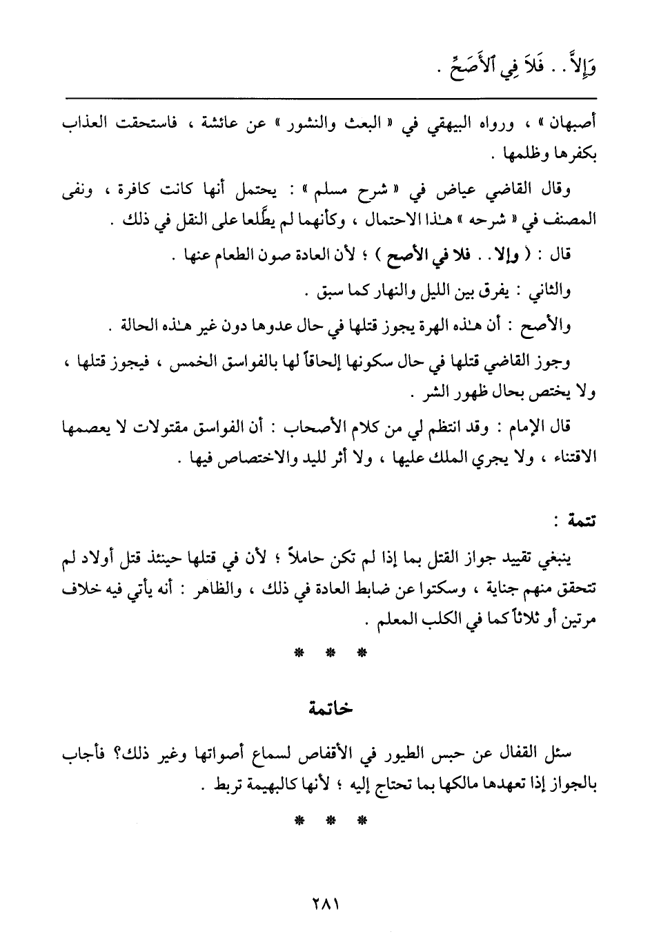 ينبغي تقييد جواز القتلى بما إذا لم تكن حاملًا: لأن في قتلها حينئذ قتل أولاد لم تتحقق منهم جناية، وسكتوا عن ضابط العادة في ذلك، والظاهر: أنه يأتي فيه خلاف مرتين أو ثلاثًا كما في الكلب المعلم.