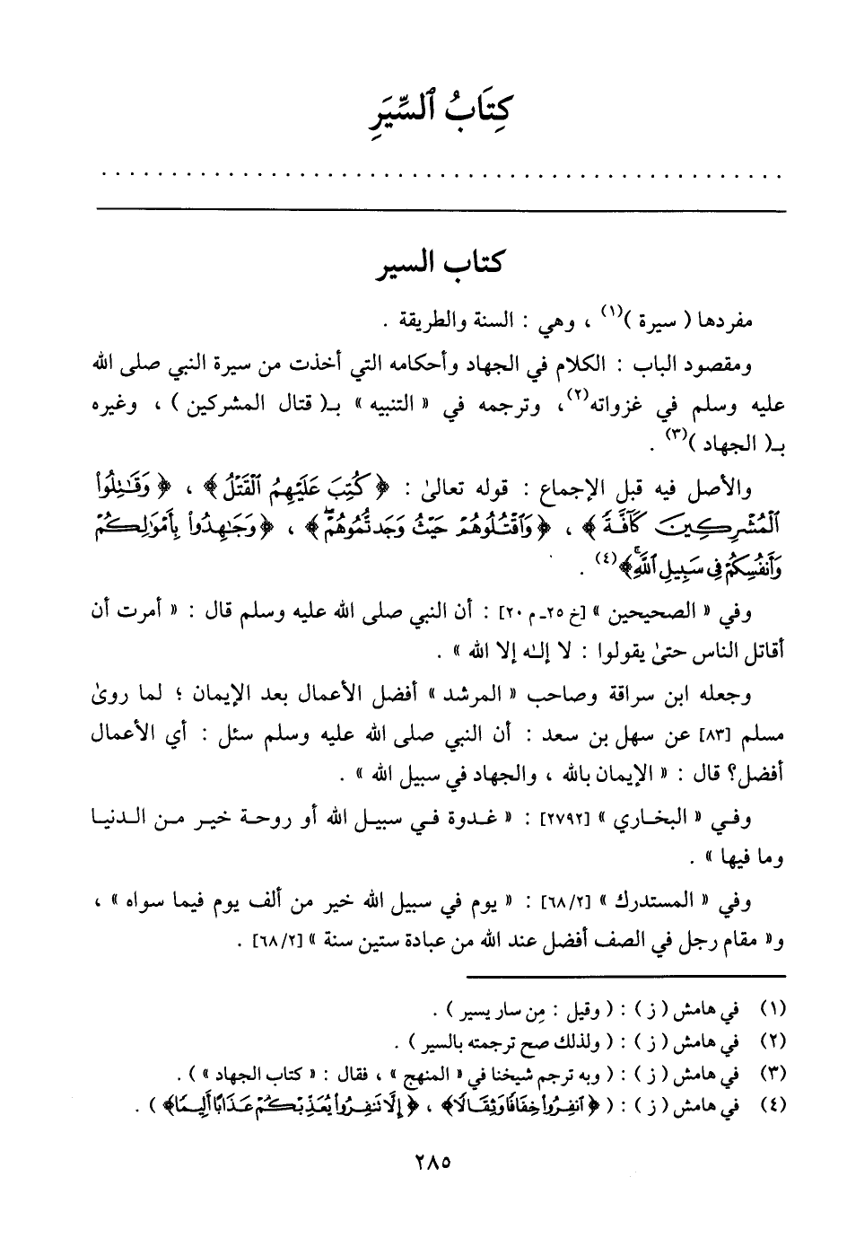 ومقصود الباب: الكلام في الجهاد وأحكامه التي أخذت من سيرة النببي صلى الله عليه وسلم في غزواته، وترجمه في (التنبيه) ب (قتال المشركين)، وغيره ب (الجهاد) والأصل فيه قبل الإجماع: قوله تعالى: {كُتِبَ عَلَيْهِمُ الْقَتْلُ}، {وَقَاتِلُوا الْمُشْرِكِينَ كَافَّةً}، {وَاقْتُلُوهُمْ حَيْثُ وَجَدْتُمُوهُمْ}، {وَجَاهِدُوا بِأَمْوَالِكُمْ وَأَنْفُسِكُمْ فِي سَبِيلِ اللَّهِ}.