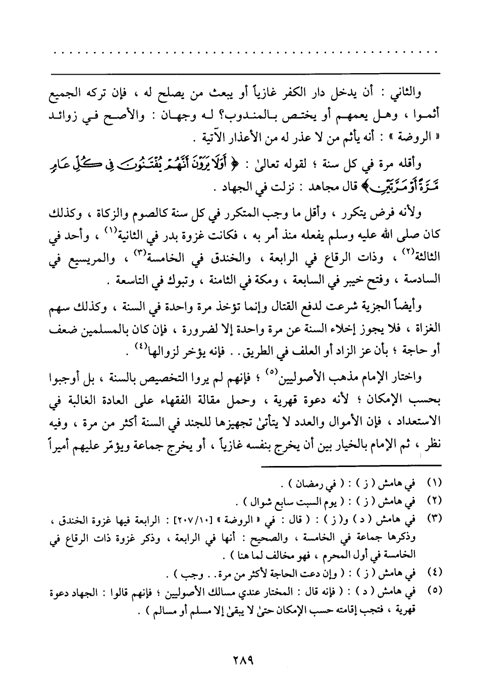 واختار الإمام مذهب الأصوليين؛ فإنهم لم يروا التخصيص بالسنة, بل أوجبوا بحسب الإمكان؛ لأنه دعوة قهرية, وحمل مقالة الفقهاء على العادة الغالبة في الاستعداد, فإن الأموال والعدد لا يتأتى تجهيزها للجند في السنة أكثر من مرة, وفية نظر, ثم الإمام بالخيار بين أن يخرج بنفسه غازيًا, أو يخرج جماعة ويؤمر عليهم أميرًا