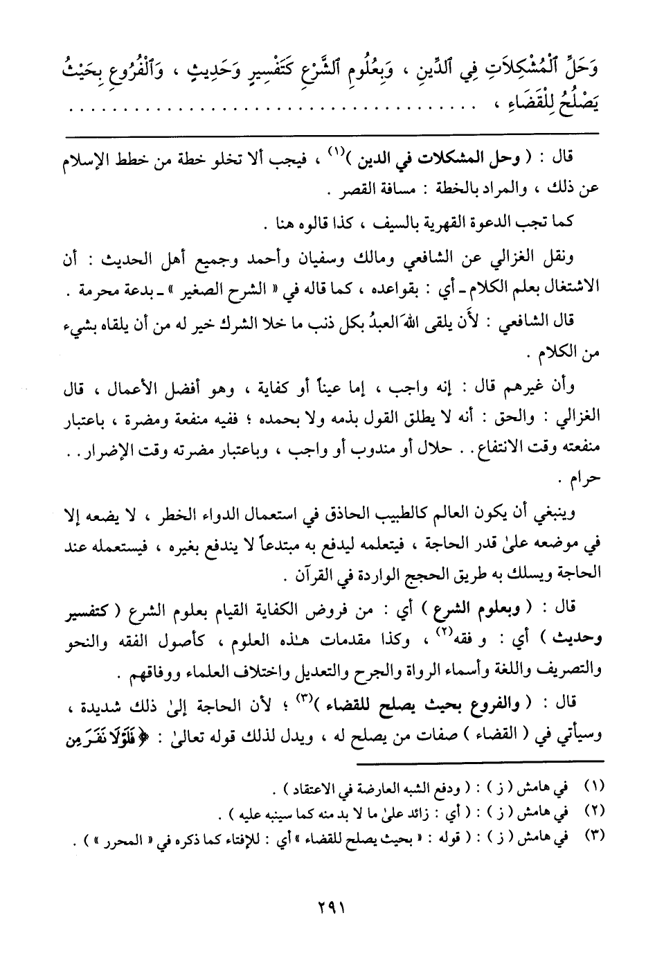 وَحَلِّ الْمُشْكِلاَتِ فِي الدِّينِ, وَبِعُلُومِ الشَّرْعِ كَتَفْسِيرٍ وَحَدِيثٍ, وَالْفُرُوعِ بِحَيْثُ يصْلُحُ لِلْقَضَاءِ,