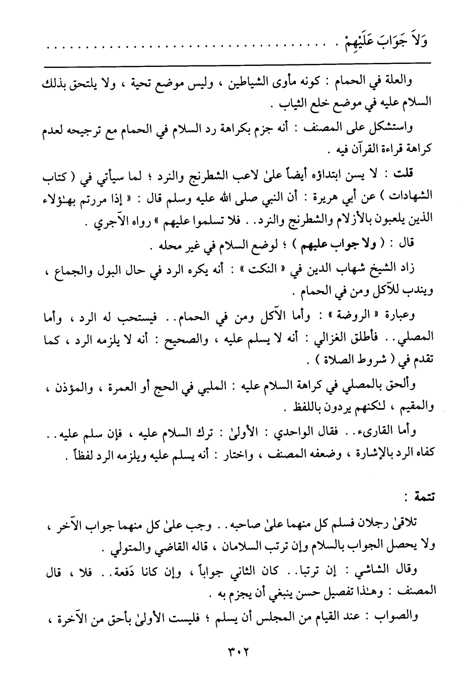 وعبارة (الروضة) وأما الآكل ومن في الحمام .. فيستحب له الرد، وأما المصلي .. فأطلق الغزالي: أنه لا يسلم عليه، والصحيح: أنه لا يلزمه الرد، كما تقدم في (شروط الصلاة).
