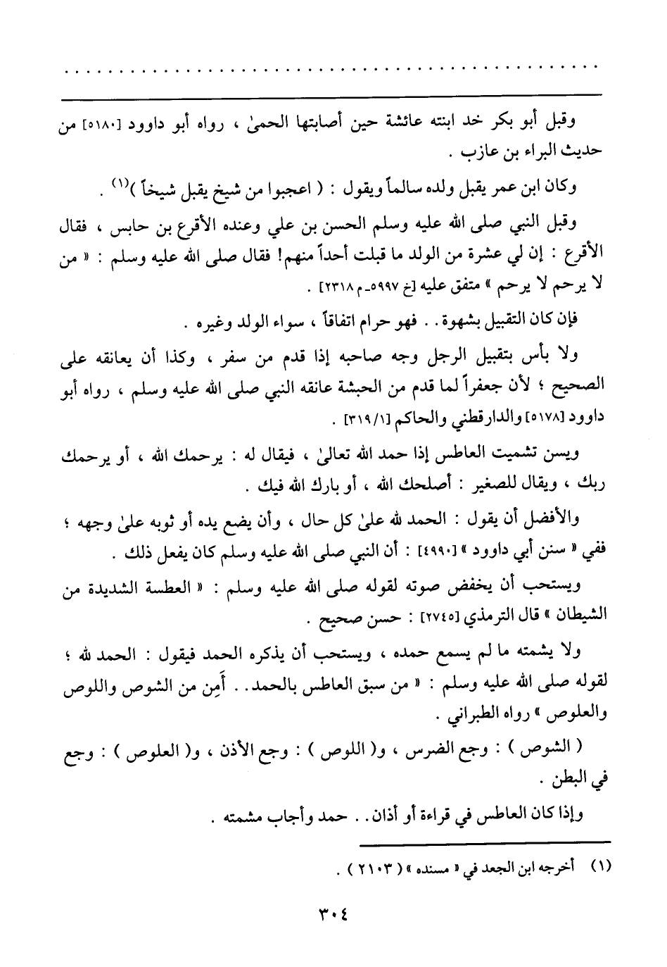 ولا بأس بتقبيل الرجل وجه صاحبه إذا قدم من سفر، وكذا أن يعانقه على الصحيح: لأن جعفرًا لما قدم من الحبشة عانقه النبي صلى الله عليم وسلم، رواه أبو داوود [5178] والدارقطني والحاكم [1/ 319].