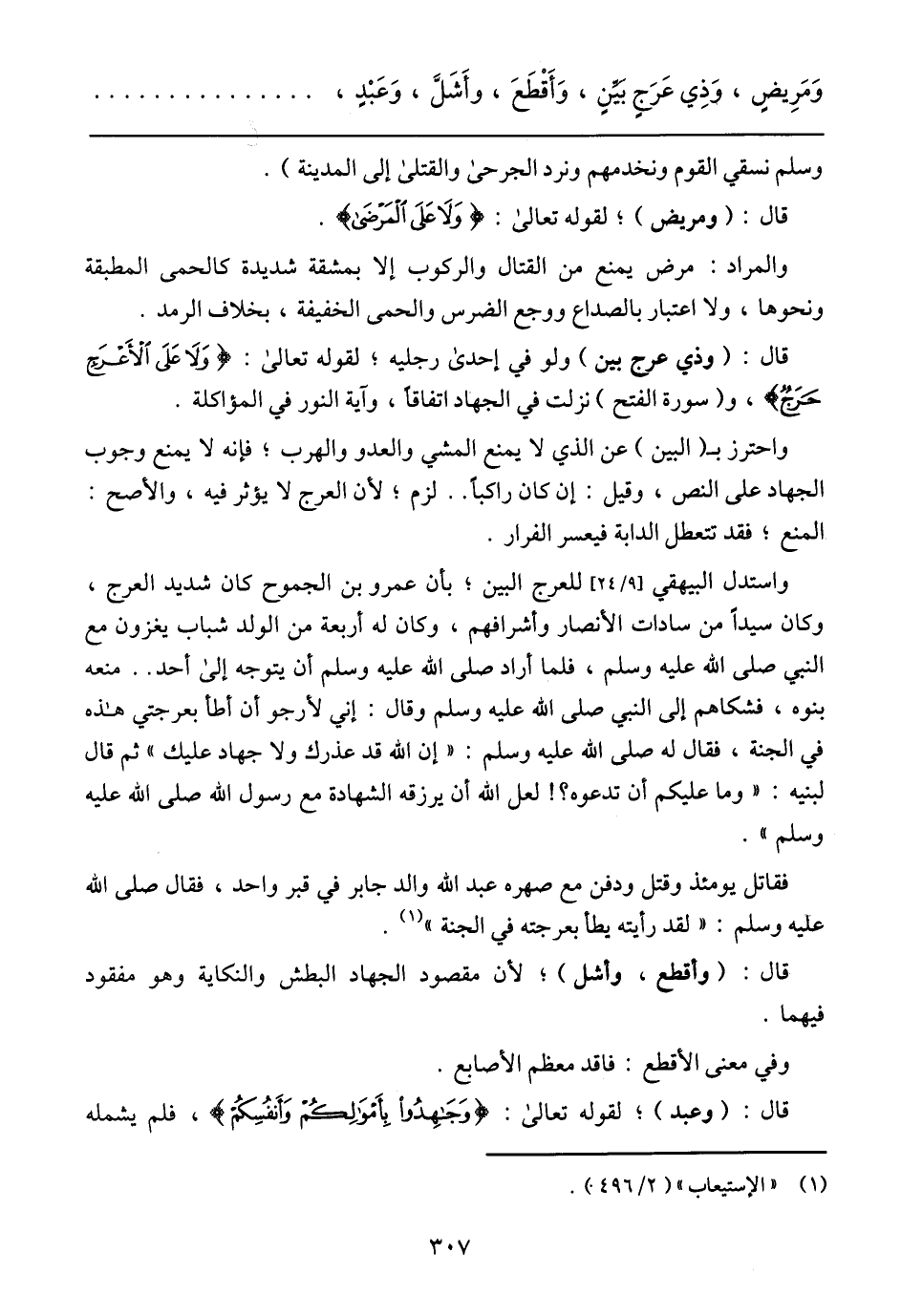 واستدل البيهقي [9/ 24] للعرج البين؛ بأن عمرو بن الجموح كان شديد العرج، وكان سيدًا من سادات الأنصار وأشرافهم، وكان له أربعة من الولد شباب يغزون مع النبي صلى الله عليه وسلم، فلما أراد صلى الله عليه وسلم أن يتوجه إلي أحد .. منعه بنوه، فشكاهم إلى النبي صلي الله عليه وسلم وقال: إني لأرجو أن أطأ بعرجتي هذه في الجنة، فقال له صلى الله عليه وسلم: (إن الله قد عذرك ولا جهاد عليك) ثم قال لبنيه) (وما عليكم أن تدعوه؟! لعل الله أن يرزقه الشهادة مع رسول الله صلى الله عليه وسلم).