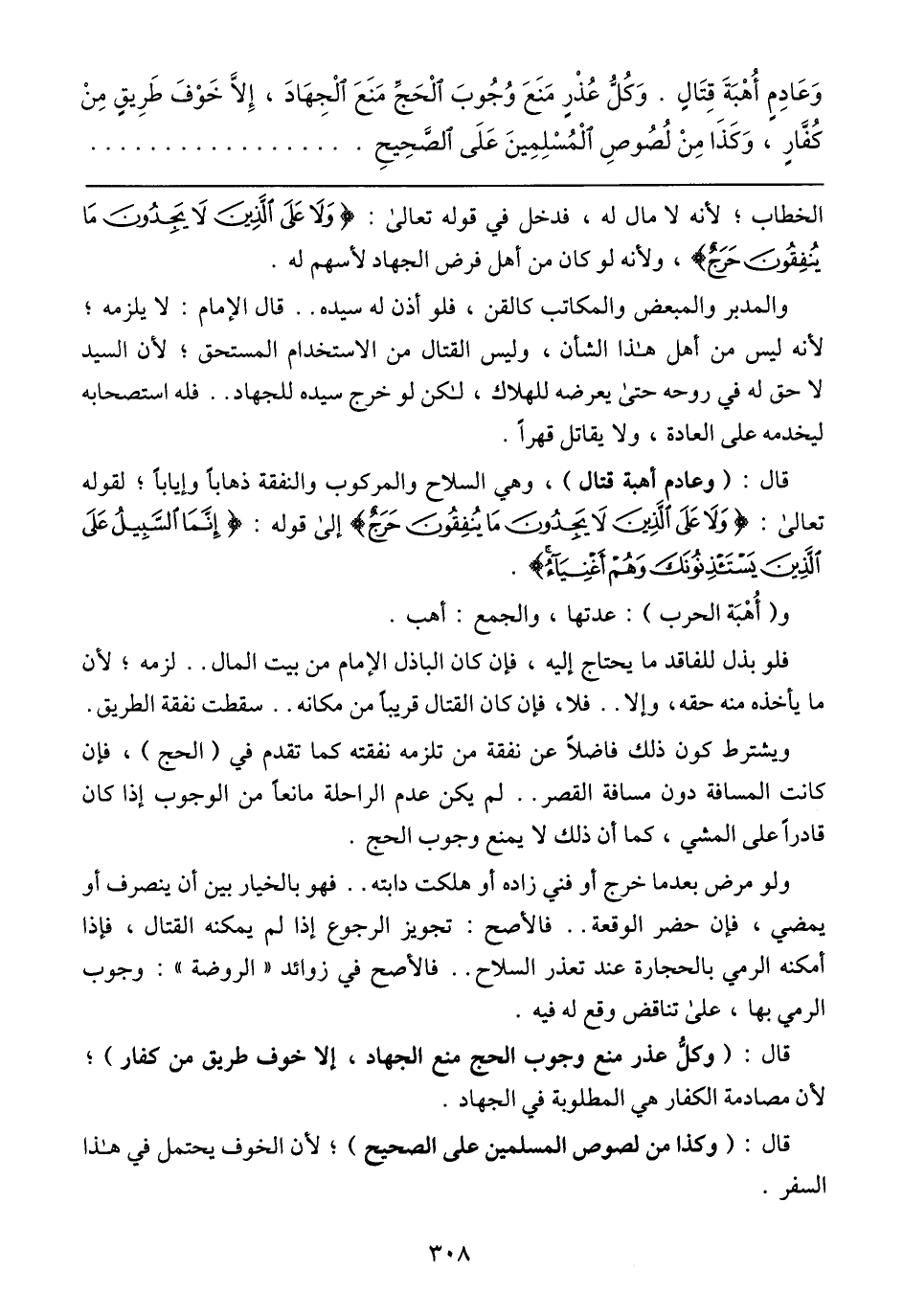 قال: (وعادم أهبة قتال)، وهي السلاح والمركوب والنفقة ذهابًا وإيابًا؛ لقوله تعالي: {وَلَا عَلَى الَّذِينَ لَا يَجِدُونَ مَا يُنْفِقُونَ حَرَجٌ} إلى قوله: {إِنَّمَا السَّبِيلُ عَلَى الَّذِينَ يَسْتَاذِنُونَكَ وَهُمْ أَغْنِيَاءُ}.