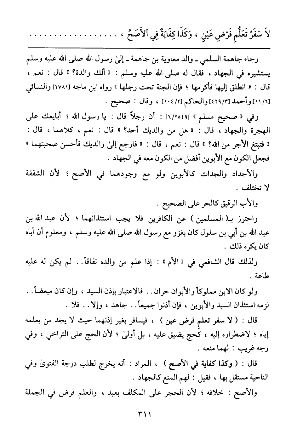 قال: (وكذا كناية في الأصح)، المراد: أنه يخرج لطلب درجة الفتوي وفي الناحية مستقل بها، فقيل: لهم المنع كالجهاد.