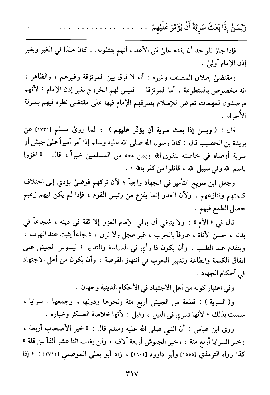 قال: (ويسن إذا بعث سرية أن يؤمِّر عليهم)؛ لما روى مسلم [1731] عن بريدة بن الحصيب قال: كان رسول الله صلى الله عليه وسلم إذا أمر أميرًا على جيش أو سرية أوصاه في خاصته بتقوى الله وبمن معه من المسلمين خيرًا قال: (اغزوا باسم الله وفي سبيل الله، قاتلوا من كفر بالله).