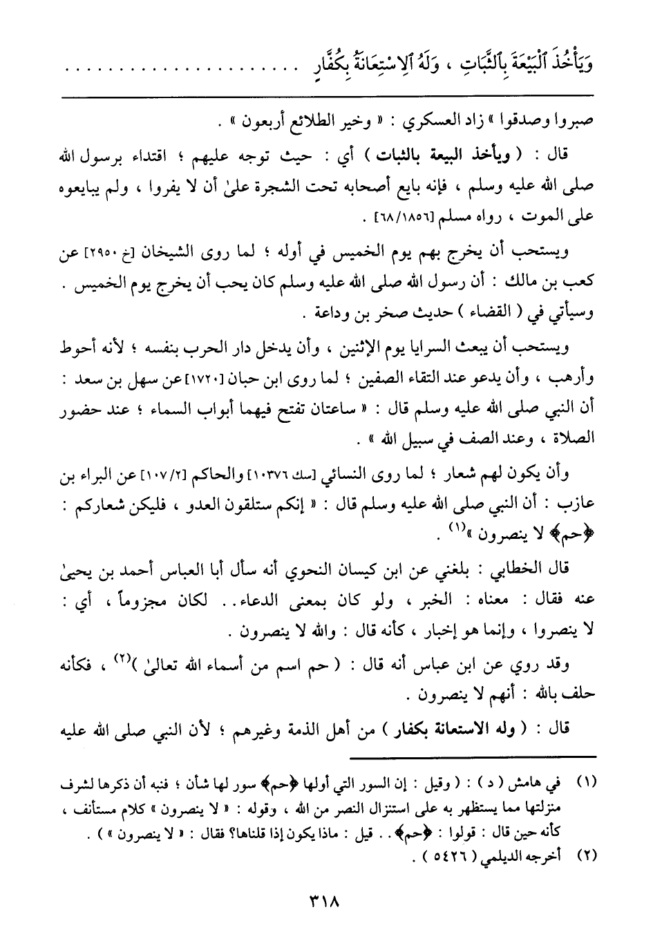 وَيَاخُذَ الْبَيْعَةَ بِالثَّبَاتِ، وَلَهُ الاِسْتِعَانَةُ بِكُفَّارِ