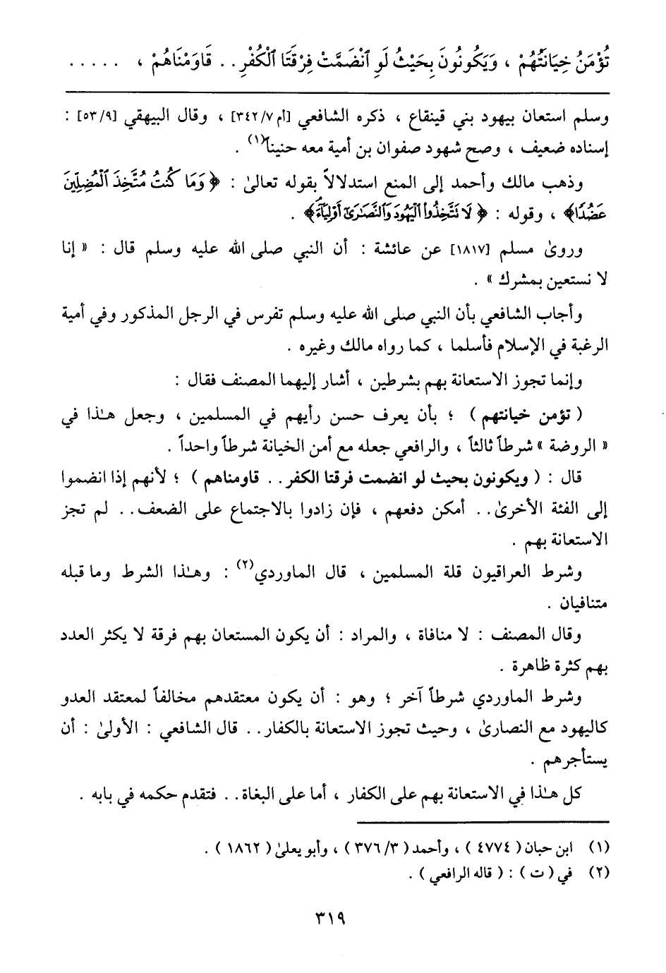 وشرط الماوردي شرطًا آخر؛ وهو: أن يكون معتقدهم مخالفًا لمعتقد العدو كاليهود مع النصارى، وحيث تجوز الاستعانة بالكفار .. قال الشافعي: الأولى: أن يستأجرهم.