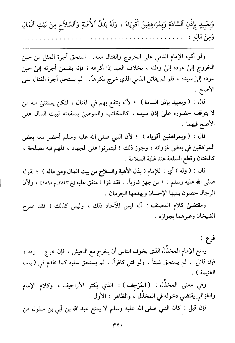 وَبِعَبِيدٍ بِإِذْنِ السَّادَةِ وَبِمُرَاهِقِينَ أَقْوِيَاءَ، وَلَهُ بَذْلُ الأُهْبةِ وَالسِّلَاحِ مِنْ بَيْتِ الْمَالِ وَمِنْ مَالِهِ