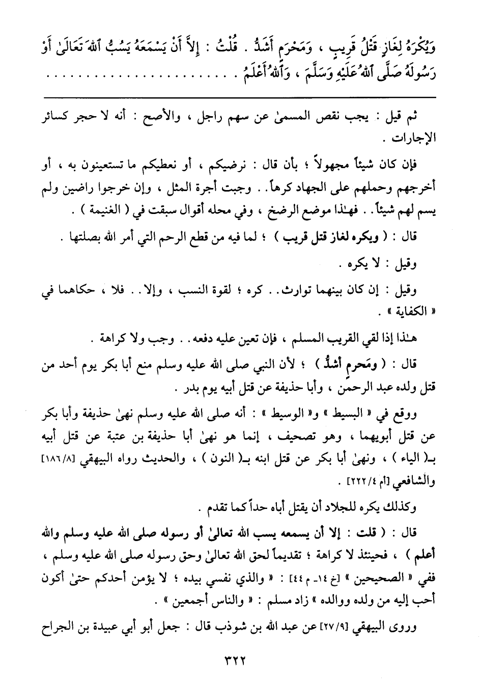 وَيُكرَهُ لِغَازٍ قَتلُ قَرِيبٍ, وَمَحرَمٍ أَشَدُّ. قُلتُ: إلاَّ أَن يَسمَعَهُ يَسُبُّ الله تَعَالَى أَو رَسُولَهُ صلى الله عليه وسلم, واللهُ أَعلَمُ