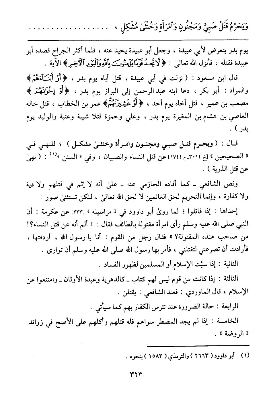 وَيَحرُمُ قَتلُ صَبِيِّ وَمَجنُونٍ وَامرَأَةٍ وخُنثَى مُشكِلٍ,