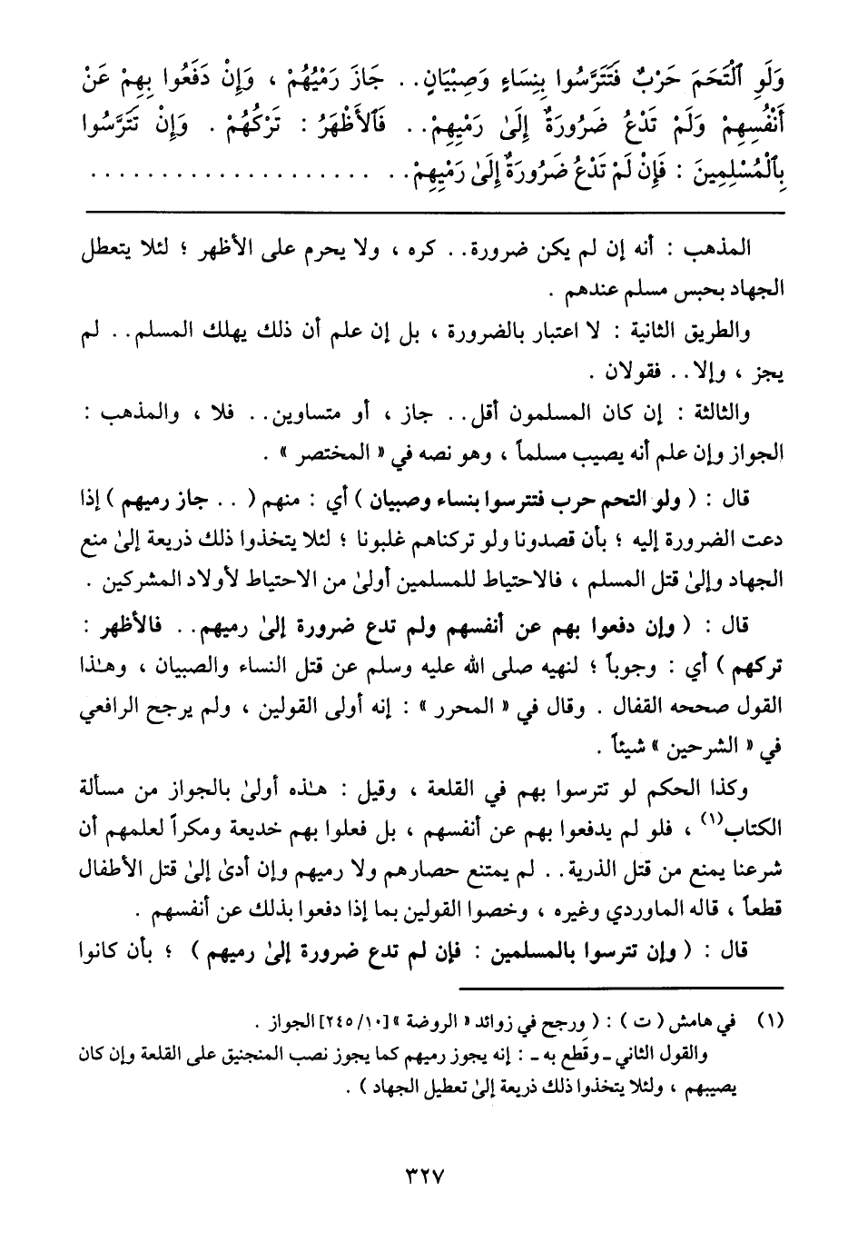 وَلَوِ التَحَمَ حَربٌ فَتَتَرسٌوا بِنِسَاءٍ وَصِبيَانٍ .. جَازَ رَميُهُم, وَإن دَفَعُوا بِهِم عَن أَنفُسِهِم وَلَم تَدعُ ضَرورَةٌ إلَى رَميِهِم .. فَالأظهَر: تَركُهُم. وَإِن تَتَرَّسُوا بِالمُسلِمِينَ: فَإن لَم تَدعُ ضَرُورَةٌ إلَى رَميِهِم