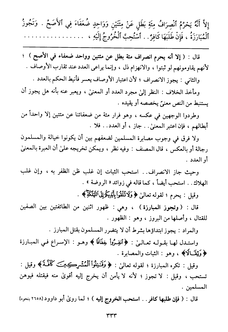 واستدل لها بقوله تعالى: {انفِرُوا خِفَافًا} وهو: الإسراع في المبارزة {وثِقَالًا} , وهو: الثبات والمصابرة.