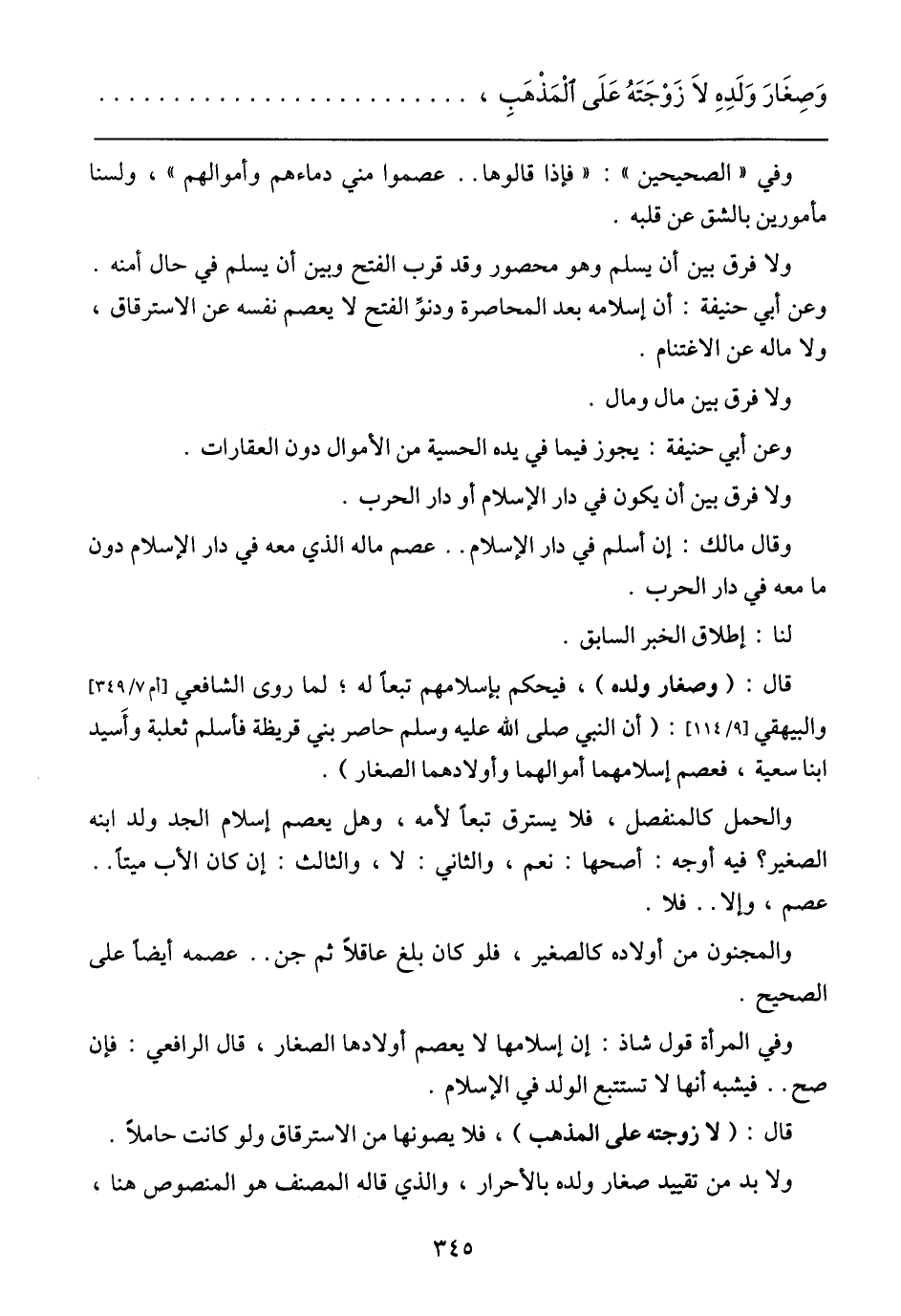 قال: (وصغار ولده)، فيحكم بإسلامهم تبعًا له؛ لما روى الشافعي [أم7/ 349] والبيهقي [9/ 114]: (أن النبي صلى الله عليه وسلم حاصر بني قريظة فأسلم ثعلبة وأسيد ابنا سعية، فعصم إسلامهما أموالهما وأولادهما الصغار).