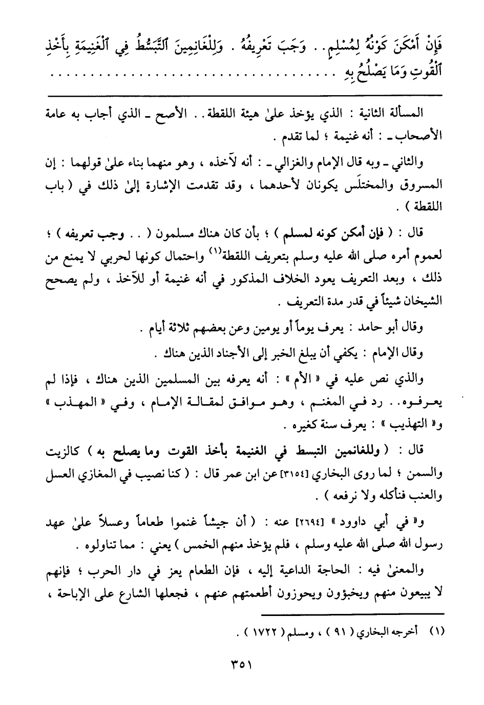 فَإِنْ أَمْكَنَ كَوْنُهُ لِمُسْلِمٍ ... وَجَبَ تَعْرِيفُهُ. وَلِلْغَانِمِينَ التَّبَسُّطُ فِي الْغَنِيمَةِ بِأَخْذِ الْقُوتِ وَمَا يَصْلُحُ بِهِ