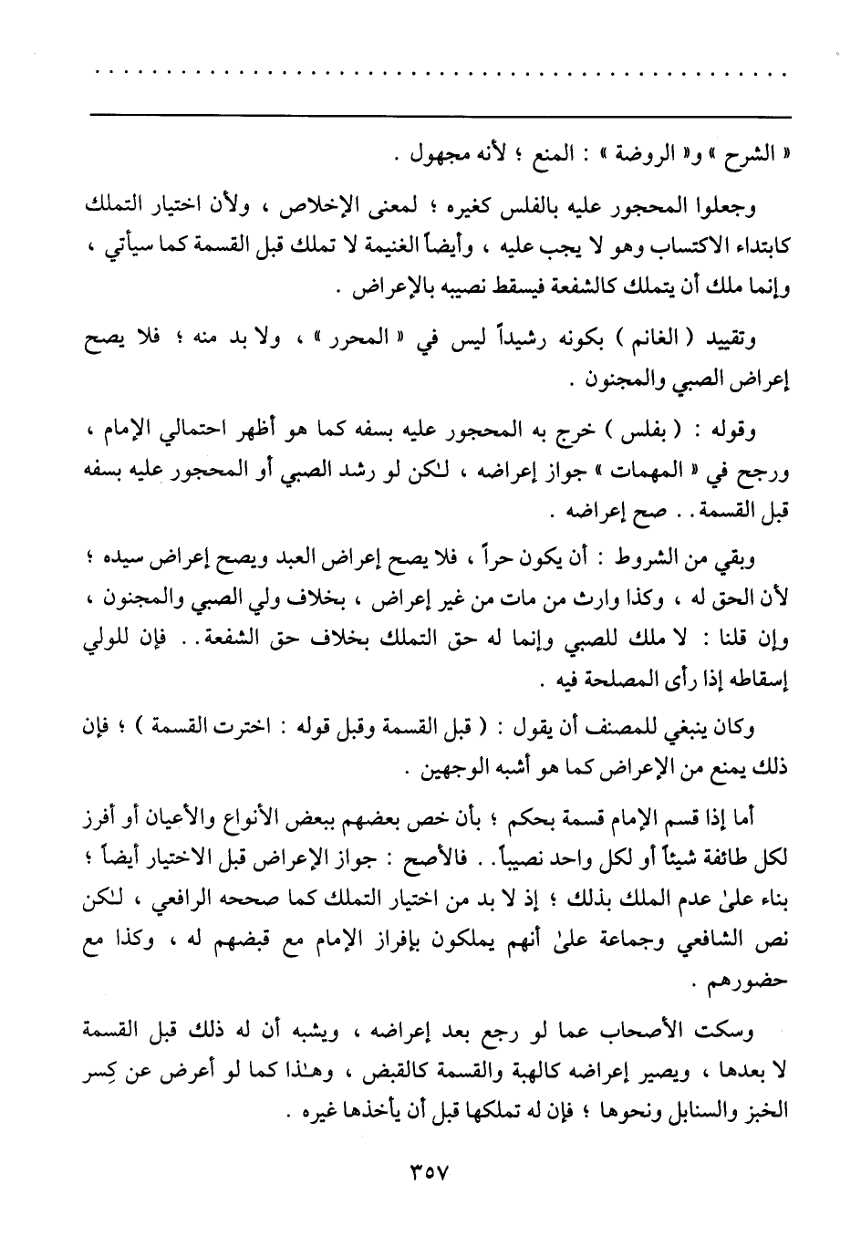 وقوله: (بفلس) خرج به المحجور عليه بسفه كما أظهر احتمالي الإمام، ورجح في (المهمات) جواز إعراضه، لكن لو رشد الصبي أو المحجور عليه بسفه قبل القسمة .. صح إعراضه.