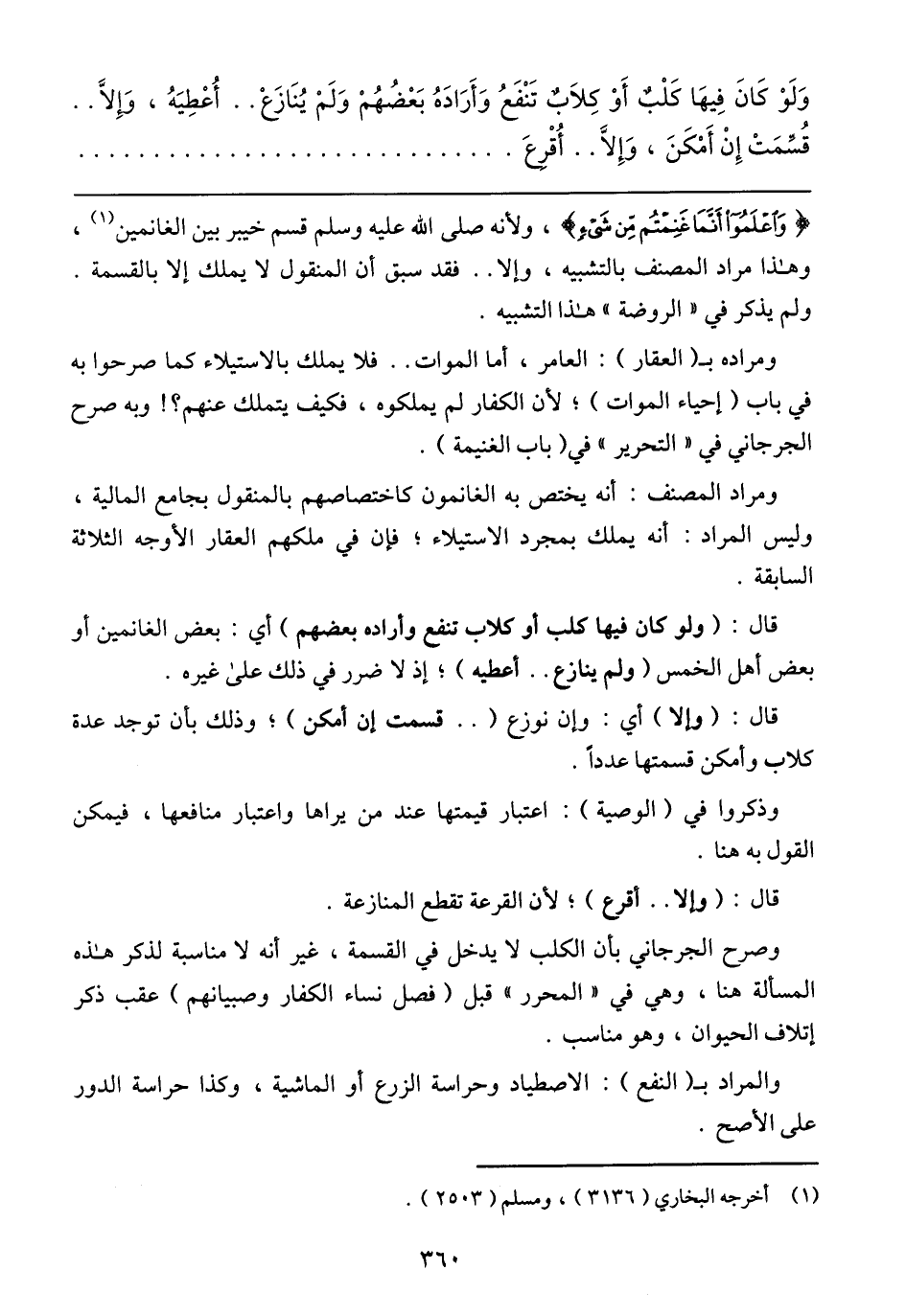 وصرح الجرجاني بأن الكلب لا يدخل في القسمة، غير أنه لا مناسبة لذكر هذه المسألة هنا، وهي في (المحرر) قبل (فصل نساء الكفار وصبيانهم) عقب ذكر إتلاف الحيوان، وهو مناسب.