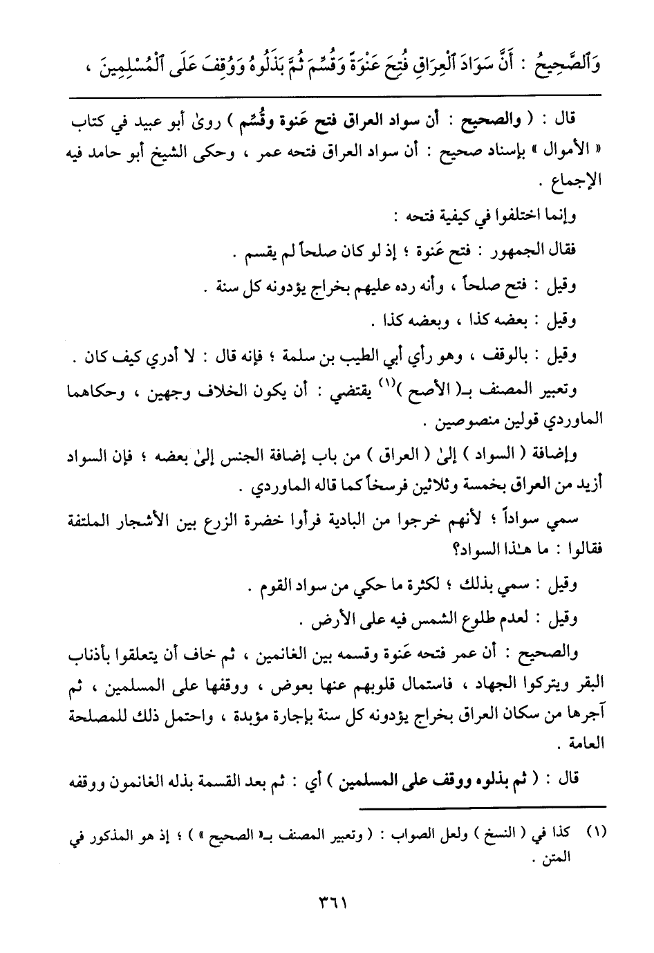 وَالصَّحِيحُ أَنْ سَوَادَ الْعِرَاقِ فُتِحَ عَنْوَةً وَقُسِّمَ ثُمَّ بَذَلُوهُ وَوُقِفَ عَلَى الْمُسْلِمِينَ،