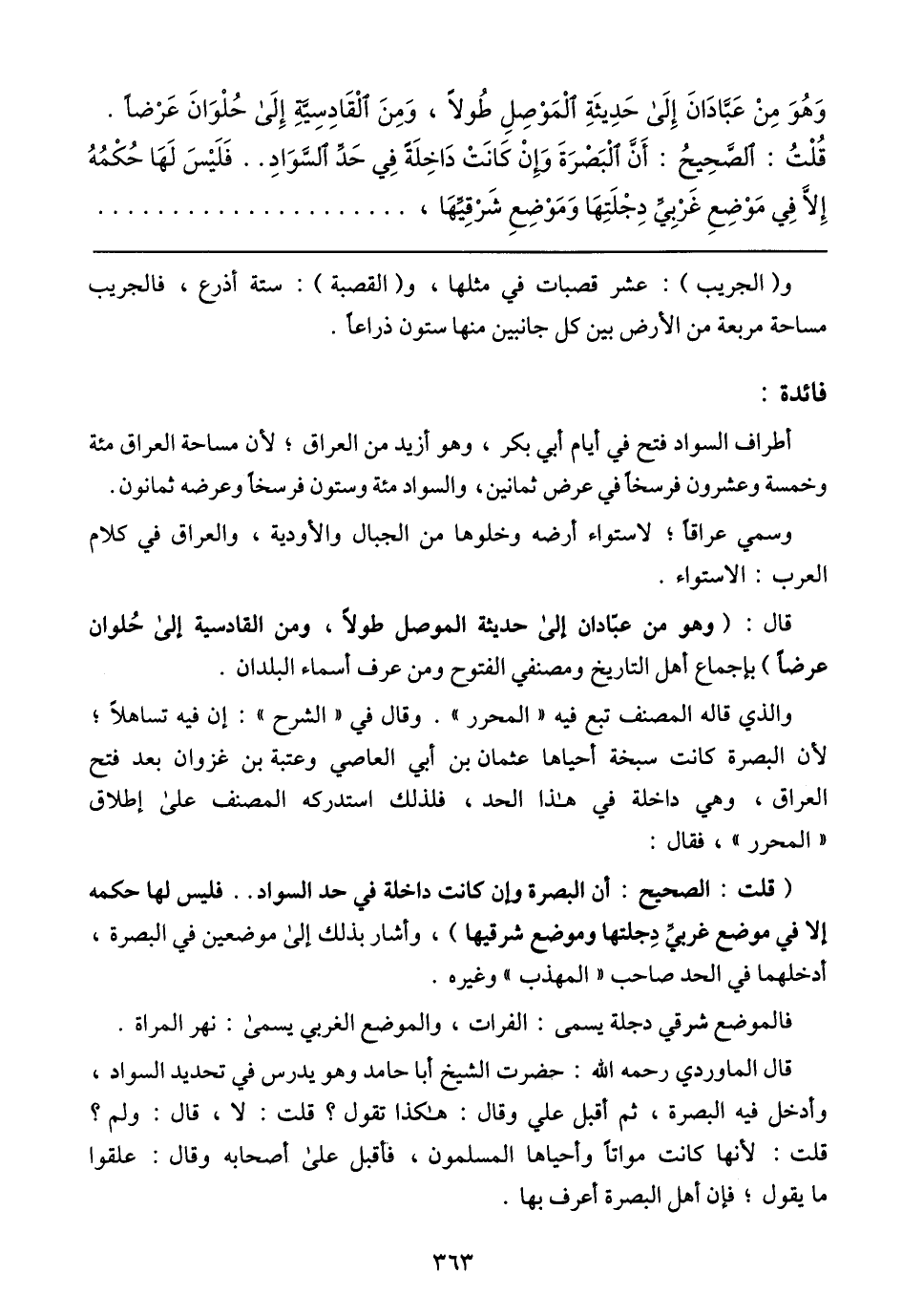 (قلت: الصحيح: أن البصرة وإن كانت داخلة في حد السواد .. فليس لها حكمه إلا في موضع غربيِّ دِجلتها وموضع شرقيها)، وأشار بذلك إلى موضعين في البصرة، أدخلهما في الحد صاحب (المهذب) وغيره.