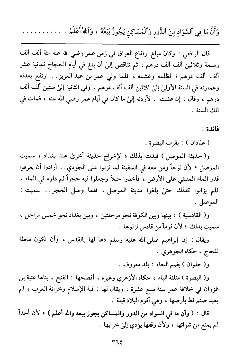 وَأَنَّ مَا فِي السَّوَادِ مِنَ الدُّورِ وَالْمَسَاكِنِ يَجُوزُ بَيْعُهُ، وَاللهُ أَعْلَمُ