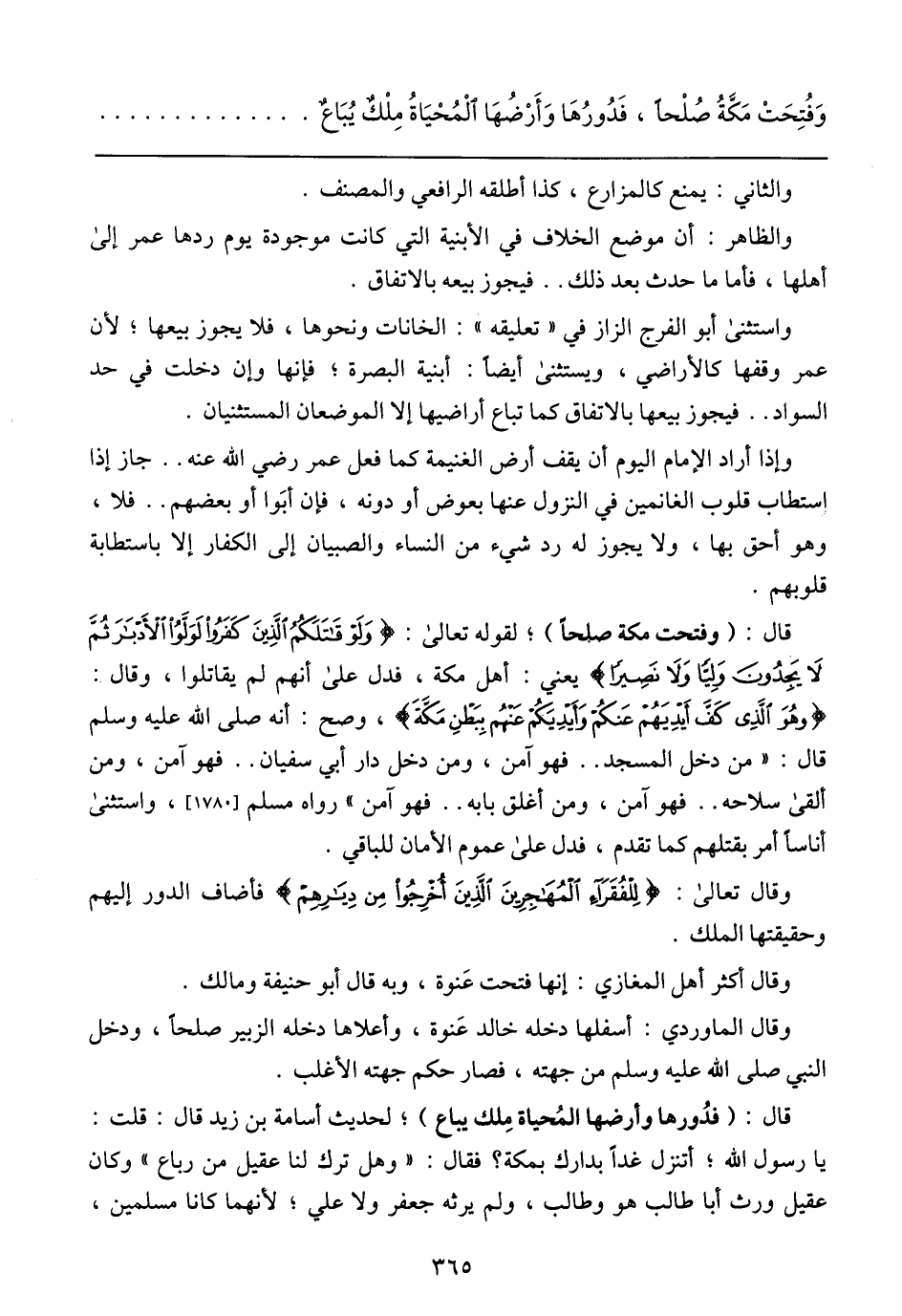 وَفُتِحَتْ مَكَّةُ صُلْحًا، فَدُورُهَا وَأَرْضُهَا الْمُحْيَاةُ مِلْكٌ يُبَاعٌ