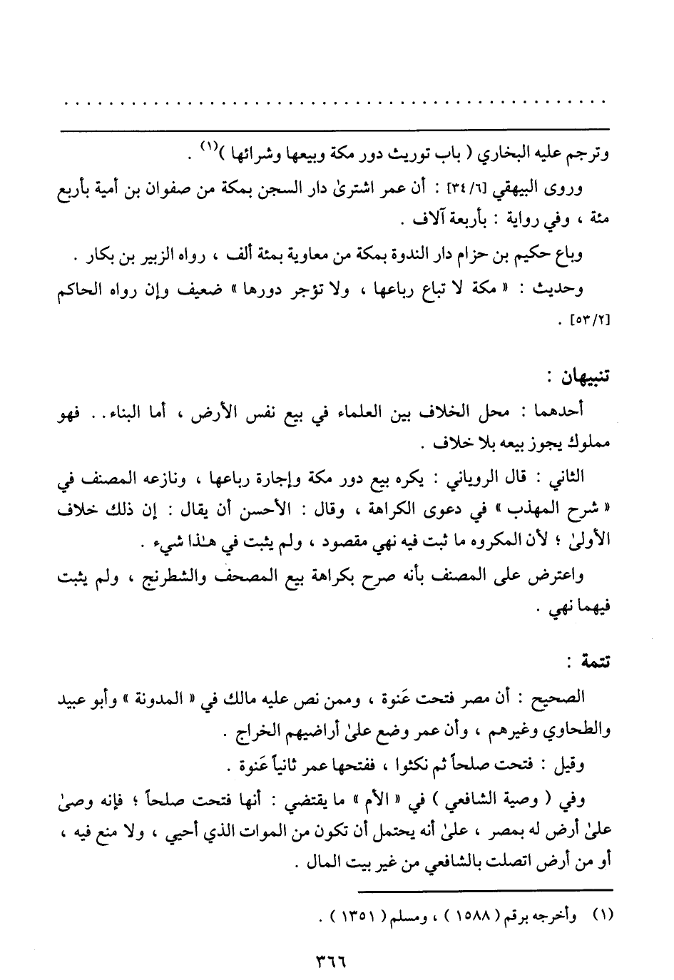 وباع حكيم بن حزام دار الندوة بمكة من معاوية بمئة ألف، رواه الزبير بن بكار. وحديث: (مكة لا تباع رباعها، ولا تؤجر دورها) ضعيف وإن رواه الحاكم [2/ 53].
