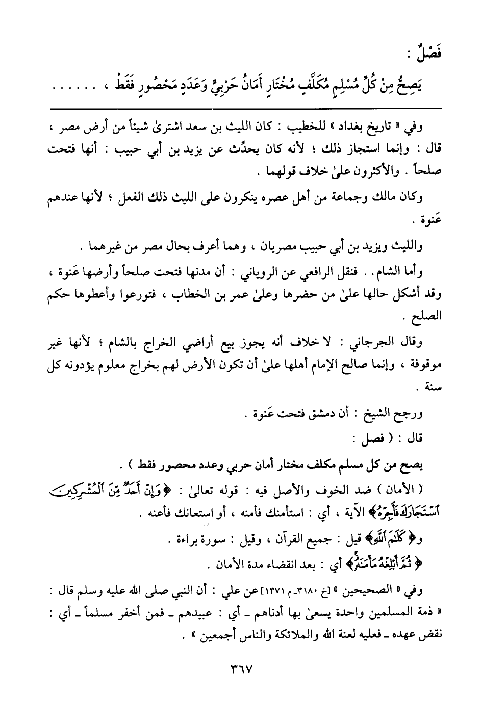 يَصِحُّ مِنْ كُلِّ مُسْلِمٍ مُكَلَّفٍ مُخْتَارٍ أَمَانُ حَرْبِيٍّ وَعَدَدٍ مَحْصُورٍ فَقَطْ،