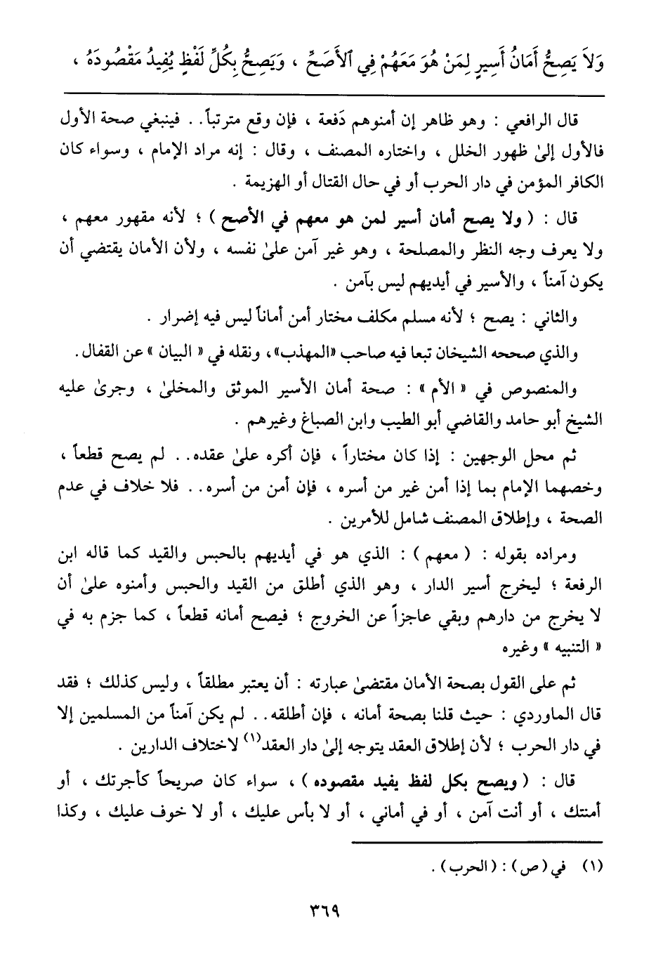 والمنصوص في (الأم) صحة أمان الأسير الموثق والمخلى، وجرى عليه الشيخ أبو حامد والقاضي أبو الطيب وابن الصباغ وغيرهم.