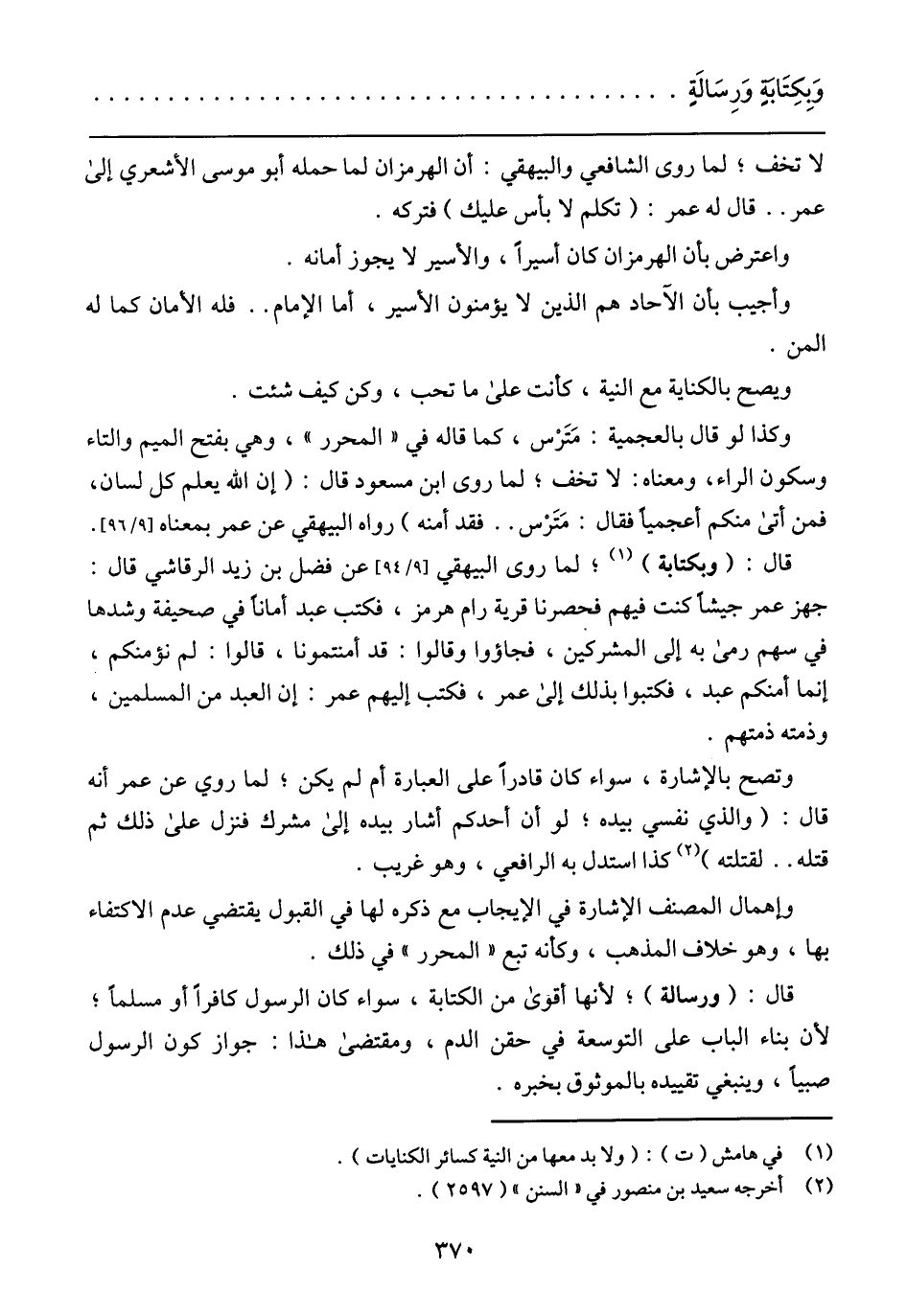 قال: (ورسالة)؛ لأنها أقوى من الكتابة، سواء كان الرسول كافرًا أو مسلمًا؛ لأن بناء الباب على التوسعة في حقن الدم، ومقتضى هذا: جواز كون الرسول صبيًا، وينبغي تقييده بالموثوق بخبره.