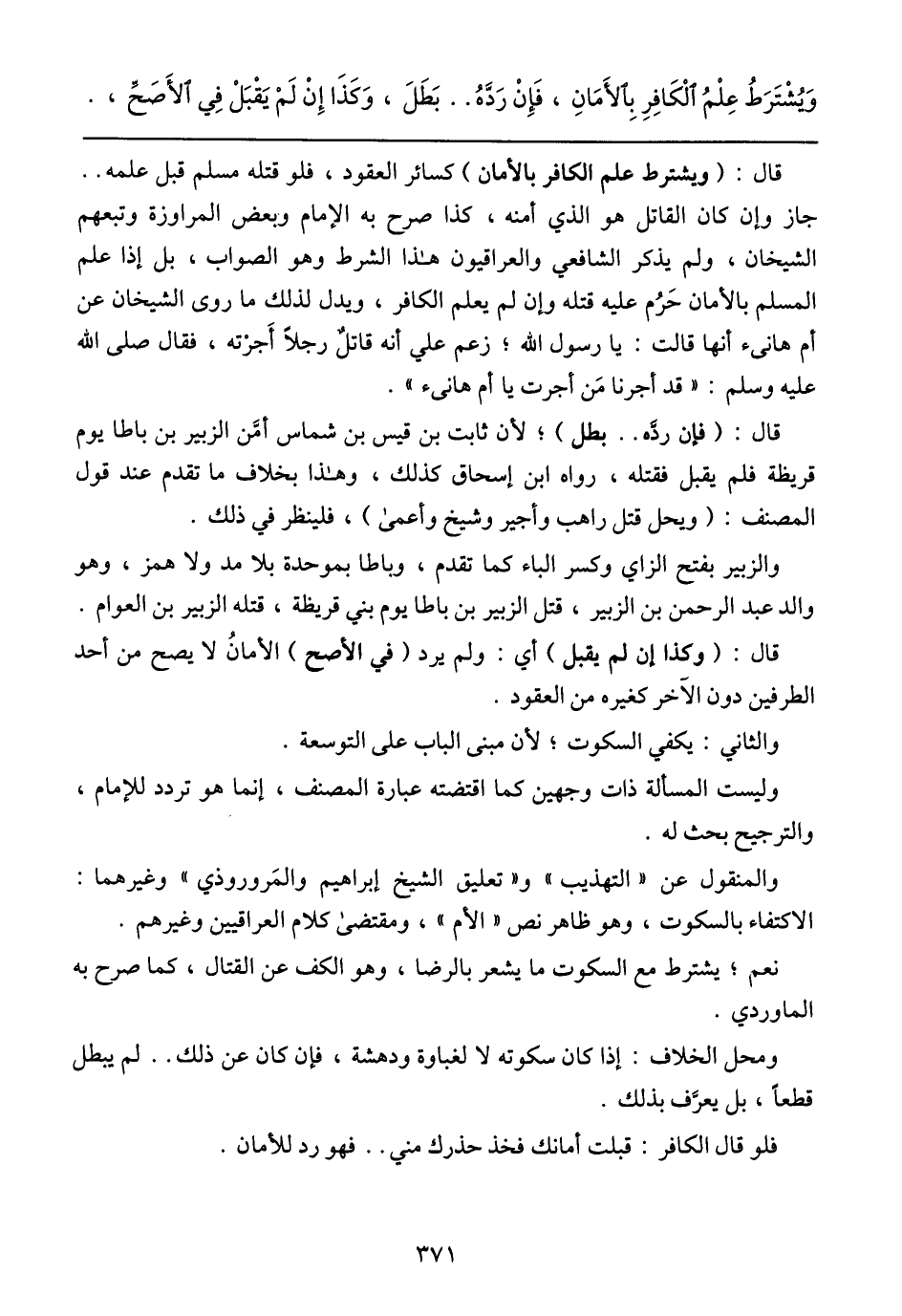 قال: (ويشترط علم الكافر بالأمان) كسائر العقود، فلو قتله مسلم قبل علمه .. جاز وإن كان القاتل هو الذي أمنه، كذا صرح به الإمام وبعض المراوزة وتبعهم الشيخان، ولم يذكر الشافعي والعراقيون هذا الشرط وهو الصواب، بل إذا علم المسلم بالأمان حَرُم عليه قتله وإن لم يعلم الكافر، ويدل لذلك ما روى الشيخان عن أم هانئ أنها قالت: يا رسول الله؛ زعم علي أنه قاتلٌ رجلًا أَجرْته، فقال صلى الله عليه وسلم: (قد أجرنا مَن أجرت يا أم هانئ).