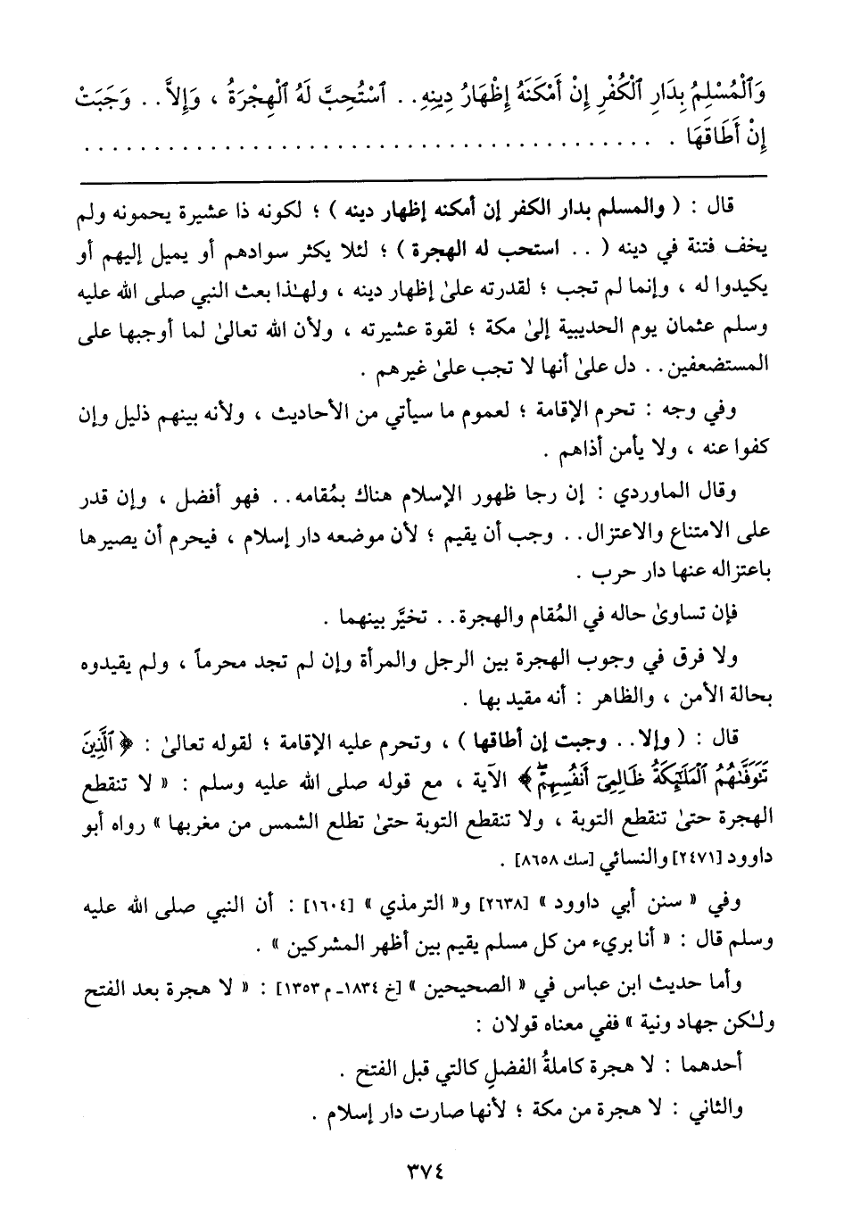 وَالْمُسْلِمُ بِدَارِ الْكُفْرِ إِنْ أَمْكَنَهُ إِظْهَارُ دِينِهِ .. اسْتُحِبَّ لَهُ الْهِجْرَةُ، وَإِلَّا .. وَجَبَتْ إِنْ أَطَاقَهَا