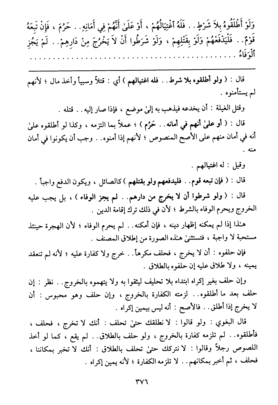 وَلَوْ أَطْلَقُوهُ بِلَا شَرْطٍ .. فَلَهُ اغْتِيَالُهُمْ، أَوْ عَلَى أَنَّهُمْ فِي أَمَانِهِ .. حَرُمَ، فَإِنْ تَبِعَهُ قَوْمٌ .. فَلْيَدْفَعْهُمْ وَلَوْ بِقَتْلِهِمْ، وَلَوْ شَرَطُوا أَنْ لَا يَخْرُجَ مِنْ دَارِهِمْ .. لَمْ يَجُزِ الْوَفَاءُ