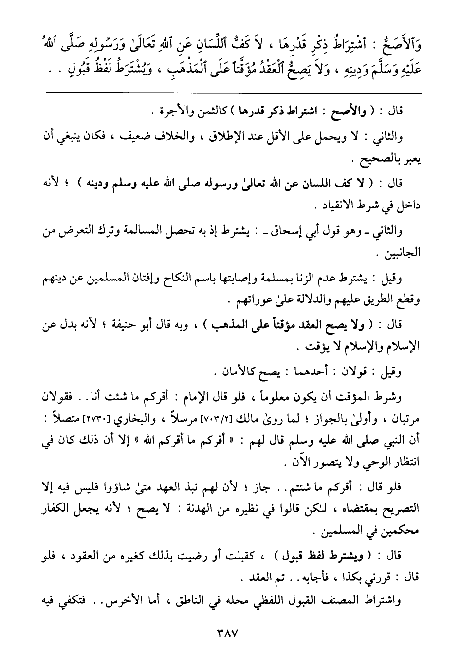 وَالأَصَحُّ: اشْتِرَاطُ ذِكْرِ قَدْرِهَا، لَا كَفُّ اللِّسَانِ عَنِ اللهِ تَعَالَى وَرَسُولِهِ صَلَّى اللهُ عَلَيْهِ وَسَلَّمَ وَدِينِهِ، وَلَا يَصِحُّ الْعَقْدُ مُؤَقَّتًا عَلَى الْمَذْهَبِ، وَيُشْتَرَطُ لَفْظُ قَبُولٍ