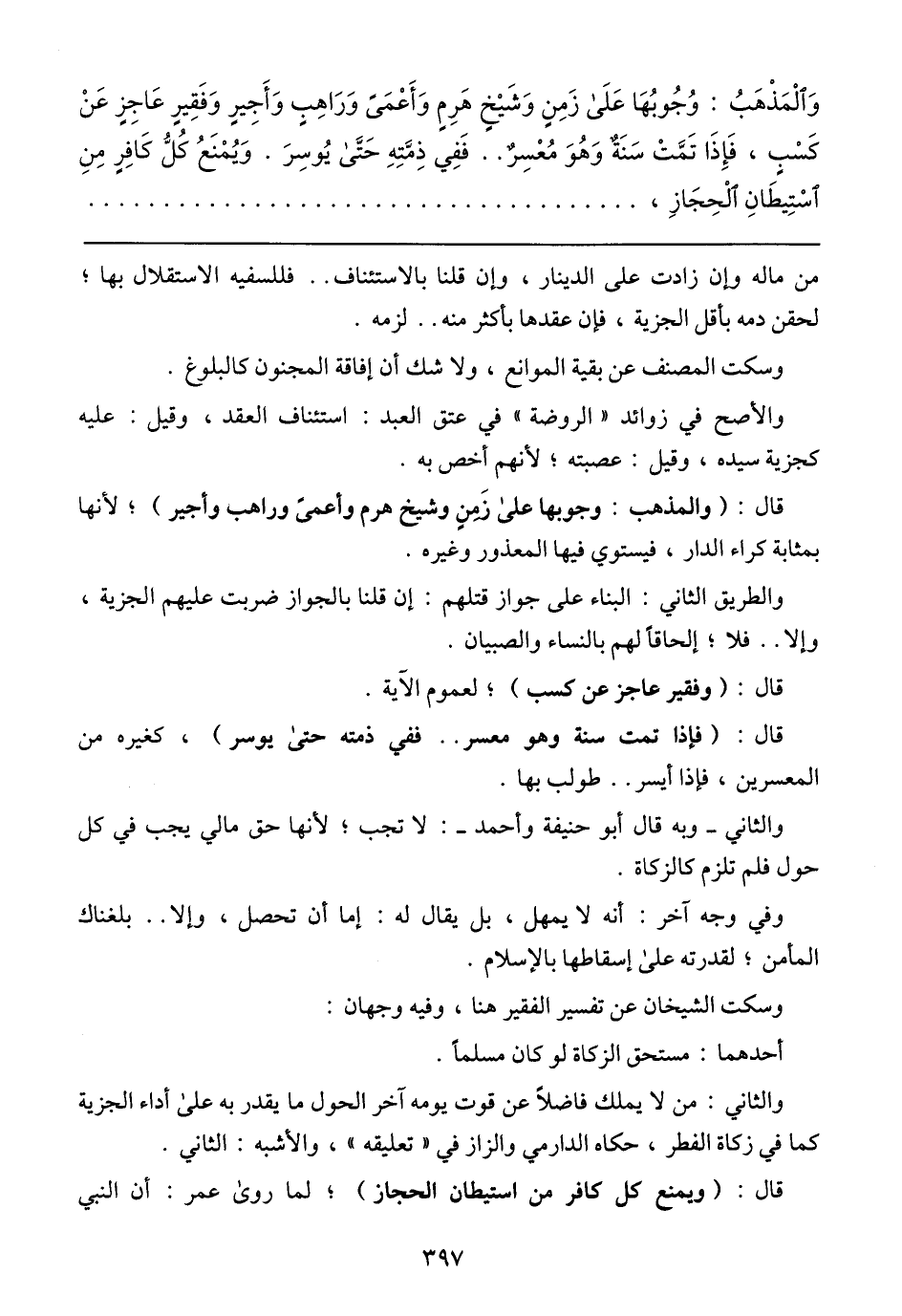 مُعْسِرٌ .. فَفِي ذِمَّتِهِ حَتَّى يُوسِرَ. وَيُمْنَعُ كُلُّ كَافِرٍ مِنِ اسْتِيطَانِ الحِجَازِ،