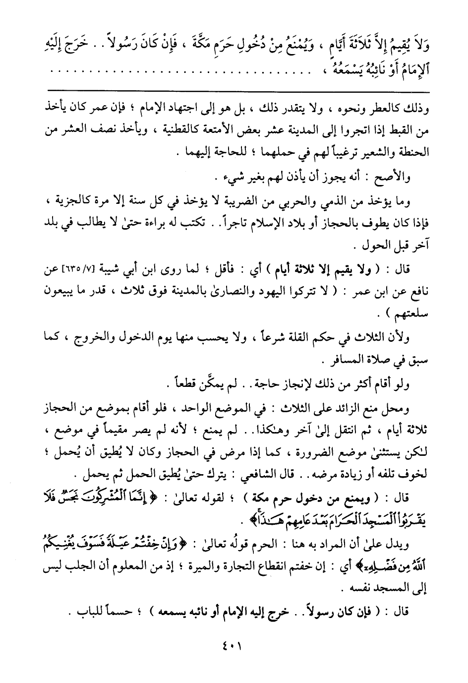 وَلَا يُقِيمُ إِلَّا ثَلَاثَةَ أَيَّامٍ، وَيُمْنَعُ مِنْ دُخُولِ حَرَمِ مَكَّةَ، فَإِنْ كَانَ رَسُولًا ... خَرَجَ إِلَيْهِ الإِمَامُ أَوْ نَائِبُهُ يَسْمَعُهُ،