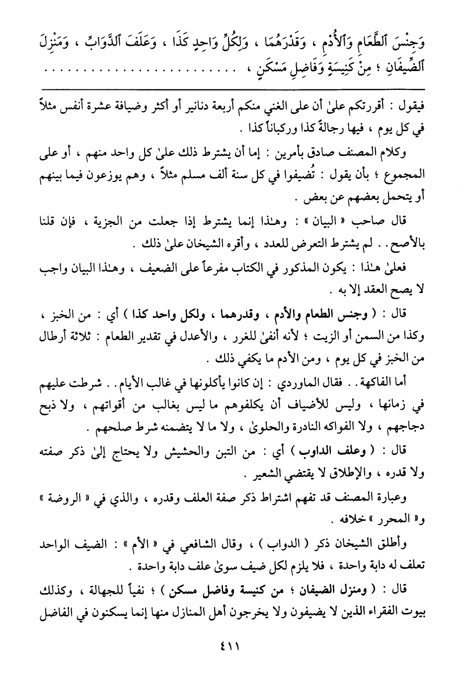 وَجِنسَ الطَّعَامِ وَالأدْمِ, وَقَدرَهمَا وَلِكلِّ وَاحِدٍ كَذَا, وَعَلَفَ الدَوَاَبِّ, وَمَنْزِلَ الضَّيَفانِ, مِنْ كَنِيسةٍ وَفَاضِلِ مَسْكَنٍ,