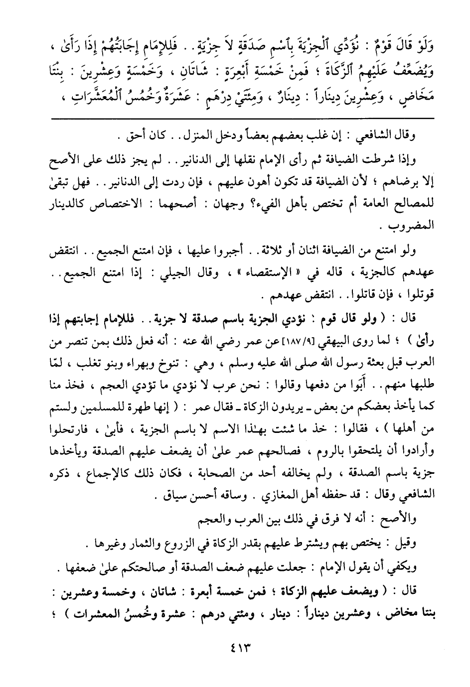 قال: (ولو قال قوم: نؤدي الجزيه باسم صدقه لا جزيه .. فللامام اجابتهم اذا راي) , لما روي البيهيقي [9/ 187] عن عمر رضي الله عنه: انه فعل ذلك بمن تنصر من العرب قبل بعثه رسول الله صلى الله عليه وسلم, وهي: تنوخ وبهراء وبنو تغلب, لما طلبها منهم ... ابوا من دفعها وقالوا: نحن عرب لا نؤدي ما تؤدي العجم, فخد منا كما يأخذ بعضكم من بعض - يريدون الزكاه - فقال عمر: (انها طهره للمسلمين ولستم من اهلها) , فقال: خذ ما شئت بهذا الاسم لا باسم الجزيه, فأبي, فارتحلوا وارادوا ان يلتحقوا بالروم, فصالحهم عمر علي ان يضعف عليهم الصدقه ويأخذوها جزيه باسم الصدقه, ولم يخالفه احد من الصحابه, فكان ذلك كالاجماع, ذكره الشافعي وقال: قد حفظه اهل المغازي. وساقه احسن سياق.