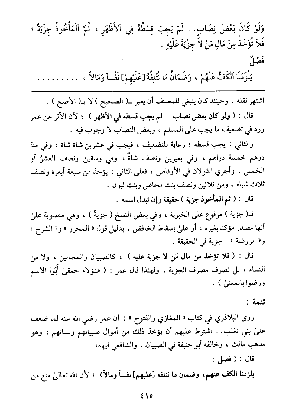 فـ (جزية) مرفوع على الخبرية، وفي بعض النسخ (جزية)، وهي منصوبة على أنها مصدر مؤكد بغيره، أو على إسقاط الخافض، بدليل قول (المحرر) و (الشرح) و (الروضة): جزية في الحقيقة.