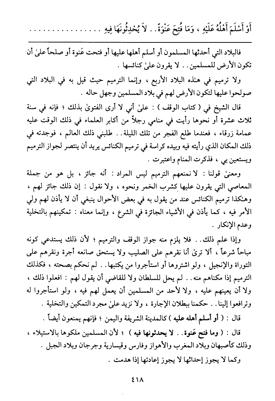 فالبلاد التي أحدثها المسلمون أو أسلم أهلها عليها أو فتحت عنوة أو صلحًا على أن تكون الأرض للمسلمين .. لا يقرون على كنائسها.