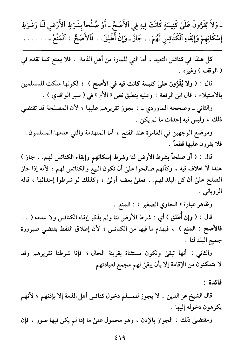 - وَلَا يُقَرُّونَ عَلَى كَنِيسَةٍ كَانَتْ فِيهِ فِي الأَصَحِّ- أَوْ صُلْحًا بِشَرْطِ الأَرْضِ لَنَا وَشَرْطِ إِسْكَانِهِمْ وَإِبْقَاءِ الْكَنَائِسِ لَهُمْ .. جَازَ- وَإِنْ أُطْلِقَ .. فَالأَصَحُّ: الْمَنْعُ-