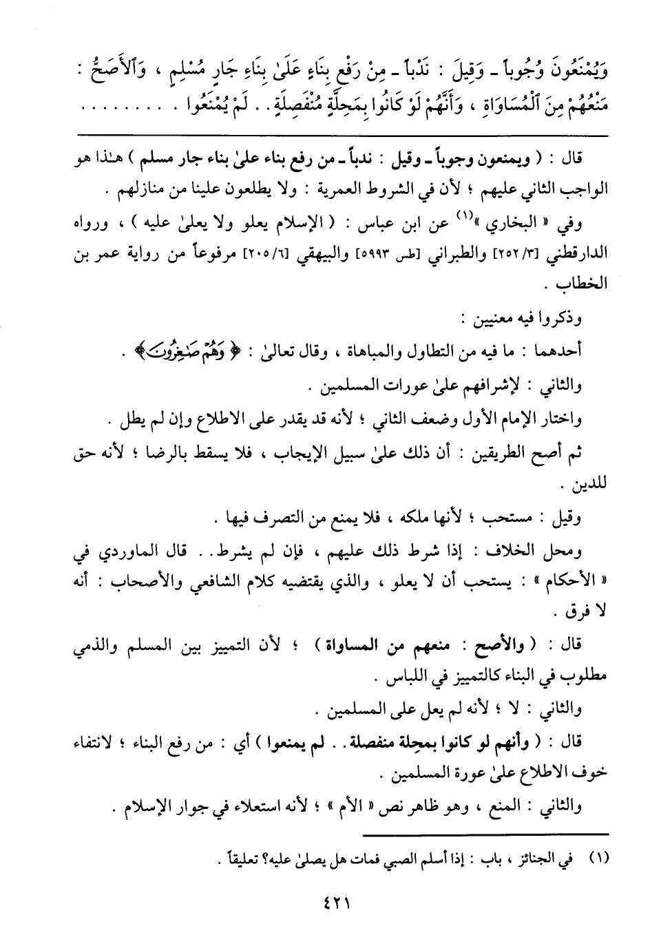 وَيُمْنَعُونَ وُجُوبًا -وَقِيلَ: نَدْبًا- مِنْ رَفْعِ بِنَاءٍ عَلَى بِنَاءِ جَارٍ مُسْلِمٍ، وَالأَصَحُّ: مَنْعُهُمْ مِنَ الْمُسَاوَاةِ، وَأَنَّهُمْ لَوْ كَانُوا بِمَحِلَّةٍ مُنْفَصِلَةٍ .. لَمْ يُمْنَعُوا