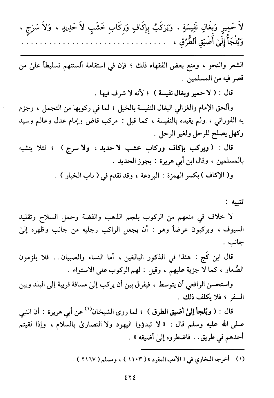 قال: (ويركب بإكاف وركاب خشب لا حديد، ولا سرج)؛ لئلا يتشبه بالمسلمين، وقال ابن أبي هريرة: يجوز الحديد.