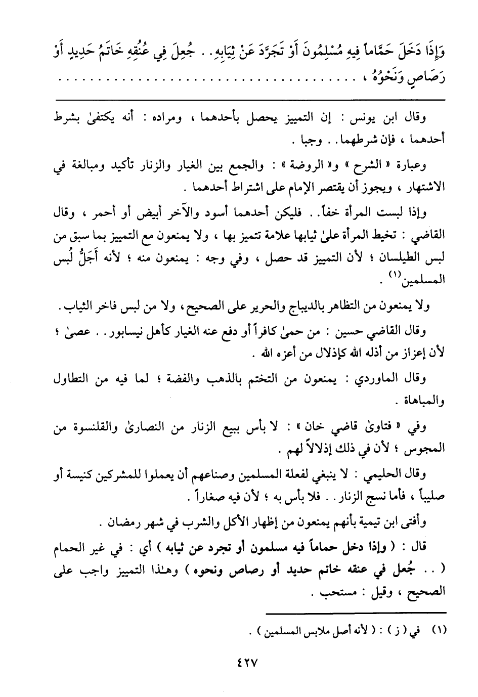 وَإذَا دَخَلَ حَمَّامًا فِيهِ مُسْلِمُونَ أَوْ تَجَرَّدَ عَنْ ثِيَابِهِ .. جُعِلَ فِي عُنُقِهِ خَاتَمُ حَدِيدٍ أَوْ رَصَاصٍ وَنَحْوُهُ،