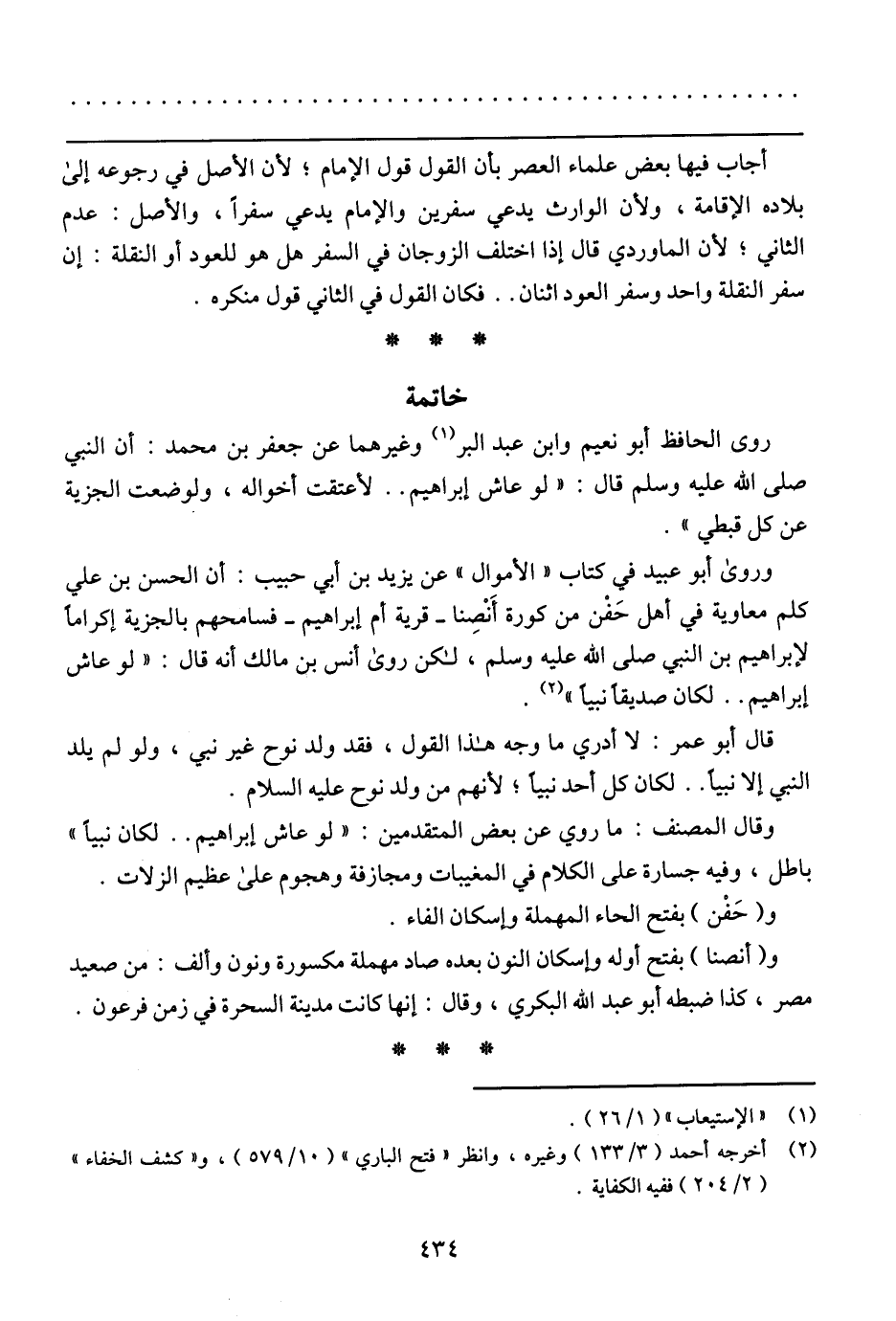 قال المصنف: ما روي عن بعض المتقدمين: (لو عاش إبراهيم .. لكان نبيًا) باطل، وفيه جسارة على الكلام في المغيبات ومجازفة وهجوم على عظيم الزلات.
