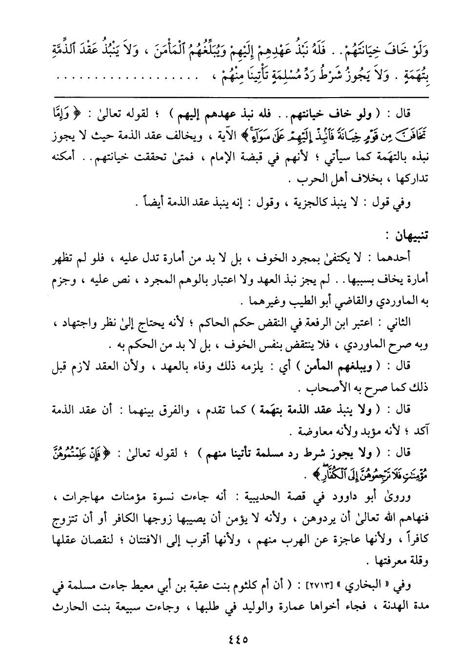 وَلَوْ خَافَ خِيَانَتَهُمْ .. فَلَهُ نَبْذ عَهْدِهِمْ إِلَيْهِم وَيُبَلِّغُهُمُ الْمَامَنَ، وَلَا يَنْبُذُ عَقْدَ الذِّمَّةِ بِتُهَمَةٍ .. وَلَا يَجُوزُ شَرْطُ رَدِّ مُسْلِمَةٍ تَاتِينَا مِنْهُمْ